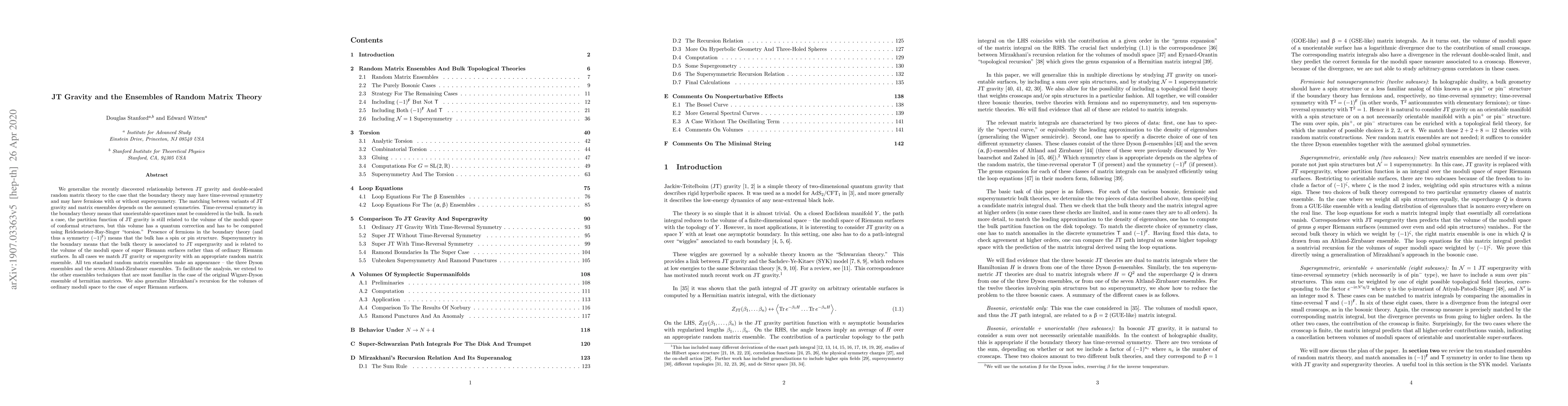 We generalize the recently discovered relationship between JT gravity and double-scaled random matrix theory to the case that the boundary theory may have time-reversal symmetry and may have fermions with or without supersymmetry. The matching between variants of JT gravity and matrix ensembles depends on the assumed symmetries. Time-reversal symmetry in the boundary theory means that unorientable spacetimes must be considered in the bulk. In such a case, the partition function of JT gravity is still related to the volume of the moduli space of conformal structures, but this volume has a quantum correction and has to be computed using Reidemeister-Ray-Singer "torsion." Presence of fermions in the boundary theory (and thus a symmetry $(-1)^F$) means that the bulk has a spin or pin structure. Supersymmetry in the boundary means that the bulk theory is associated to JT supergravity and is related to the volume of the moduli space of super Riemann surfaces rather than of ordinary Riemann surfaces. In all cases we match JT gravity or supergravity with an appropriate random matrix ensemble. All ten standard random matrix ensembles make an appearance -- the three Dyson ensembles and the seven Altland-Zirnbauer ensembles. To facilitate the analysis, we extend to the other ensembles techniques that are most familiar in the case of the original Wigner-Dyson ensemble of hermitian matrices. We also generalize Mirzakhani's recursion for the volumes of ordinary moduli space to the case of super Riemann surfaces.