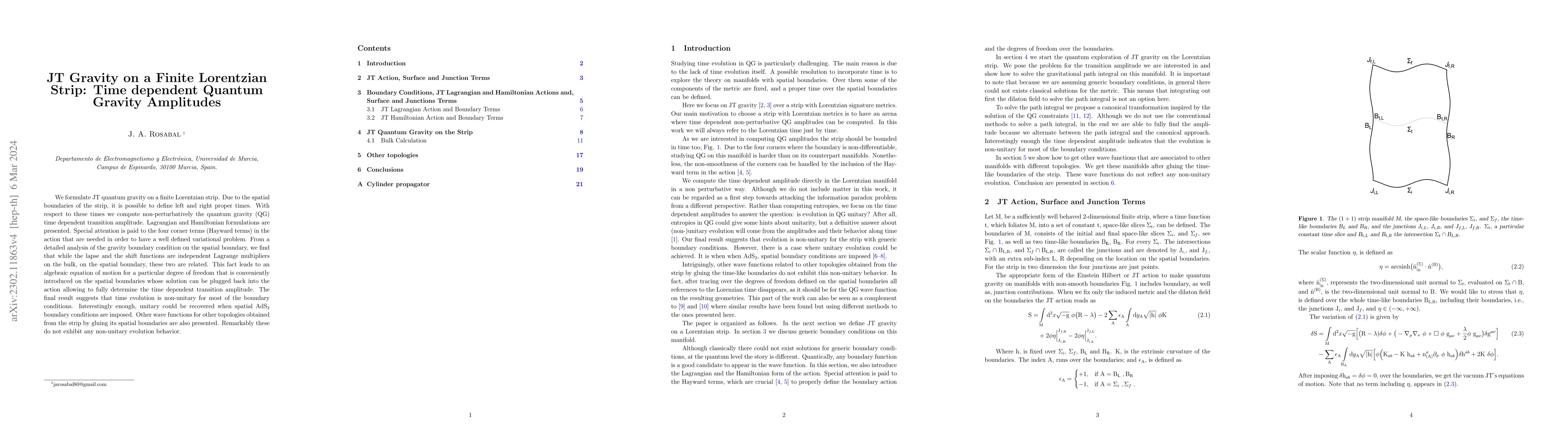 We formulate JT quantum gravity on a finite Lorentzian strip. Due to the spatial boundaries of the strip, it is possible to define left and right proper times. With respect to these times we compute non-perturbatively the quantum gravity (QG) time dependent transition amplitude. Lagrangian and Hamiltonian formulations are presented. Special attention is paid to the four corner terms (Hayward terms) in the action that are needed in order to have a well defined variational problem. From a detailed analysis of the gravity boundary condition on the spatial boundary, we find that while the lapse and the shift functions are independent Lagrange multipliers on the bulk, on the spatial boundary, these two are related. This fact leads to an algebraic equation of motion for a particular degree of freedom that is conveniently introduced on the spatial boundaries whose solution can be plugged back into the action allowing to fully determine the time dependent transition amplitude. The final result suggests that time evolution is non-unitary for most of the boundary conditions. Interestingly enough, unitary could be recovered when spatial $\text{AdS}_2$ boundary conditions are imposed. Other wave functions for other topologies obtained from the strip by gluing its spatial boundaries are also presented. Remarkably these do not exhibit any non-unitary evolution behavior.