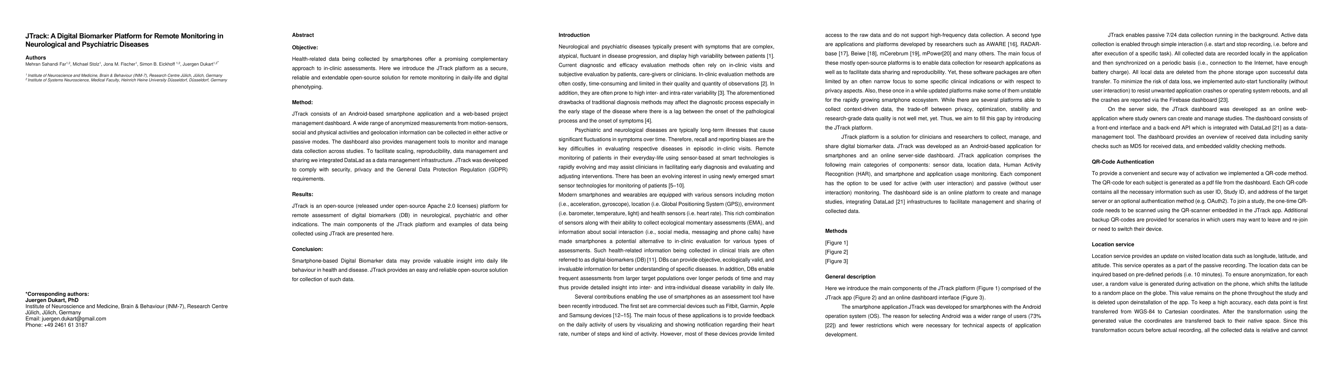 JTrack is an open-source platform for remote monitoring of neurological and psychiatric diseases using smartphone-collected digital biomarkers. It integrates an Android app and a web dashboard for secure, compliant data collection and management.