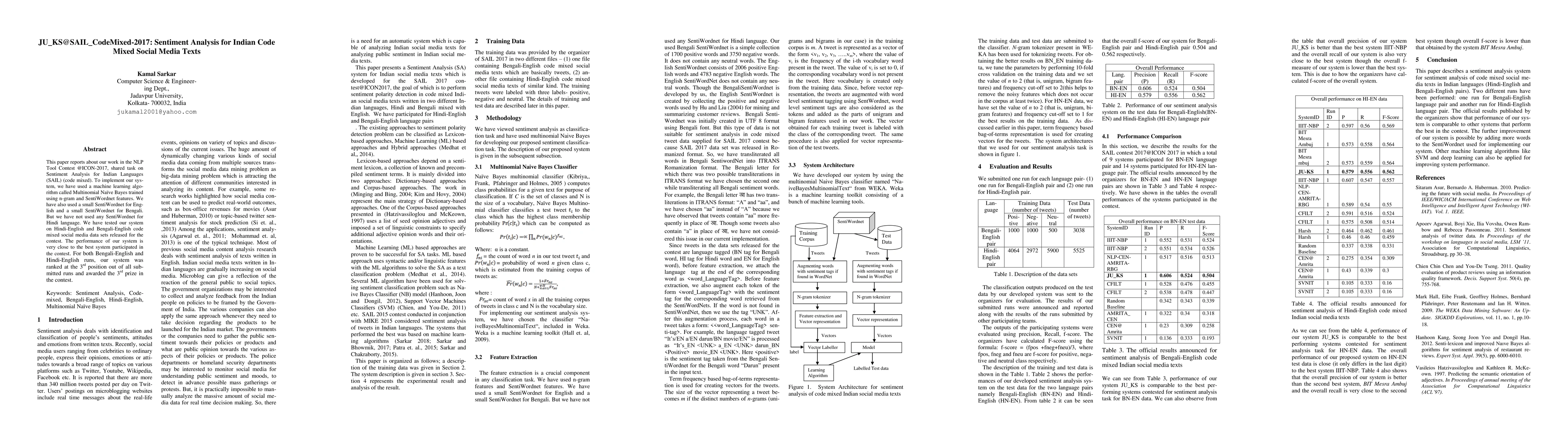 This paper presents a sentiment analysis system for Indian code-mixed social media texts using Multinomial Naive Bayes with n-gram and SentiWordnet features, achieving third place in the ICON-2017 NLP Tool Contest. The system performed well on Hindi-English and Bengali-English datasets, closely matching the top-performing system.