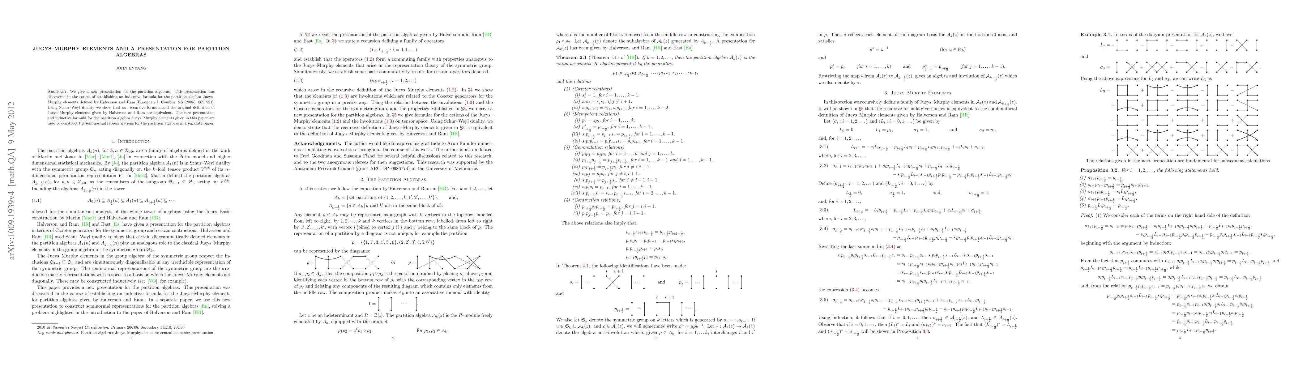This paper presents a new formulation for partition algebras, discovered while developing an inductive formula for Jucys-Murphy elements. It demonstrates the equivalence of this new presentation with the original definition through Schur-Weyl duality.