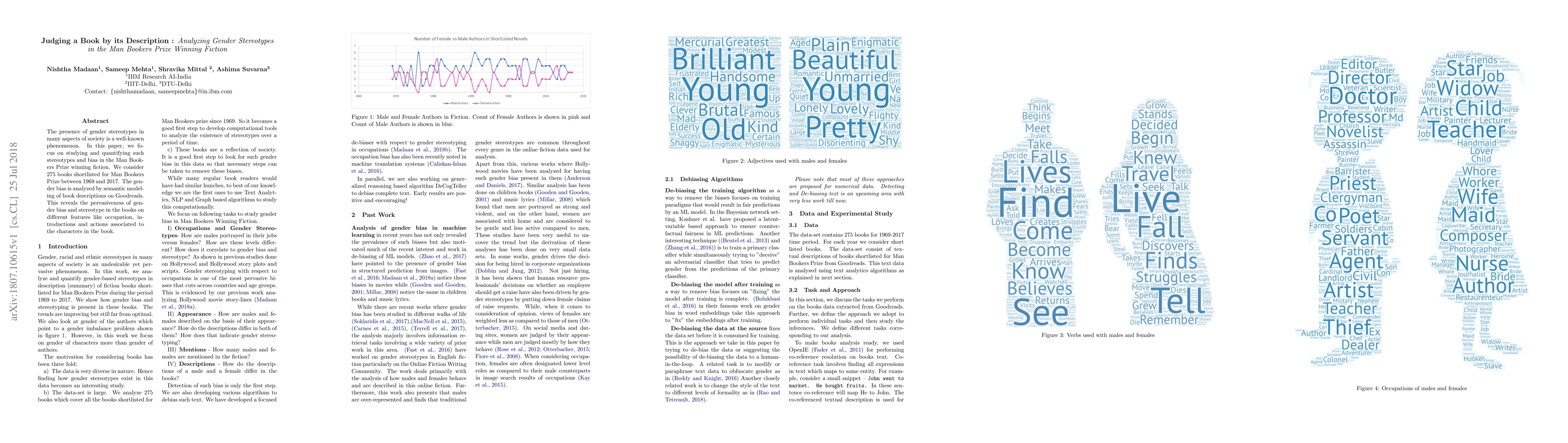 This paper examines gender stereotypes in Man Booker Prize-winning fiction by analyzing 275 shortlisted books from 1969 to 2017. The study reveals pervasive gender bias in character descriptions, particularly in occupations, introductions, and actions.