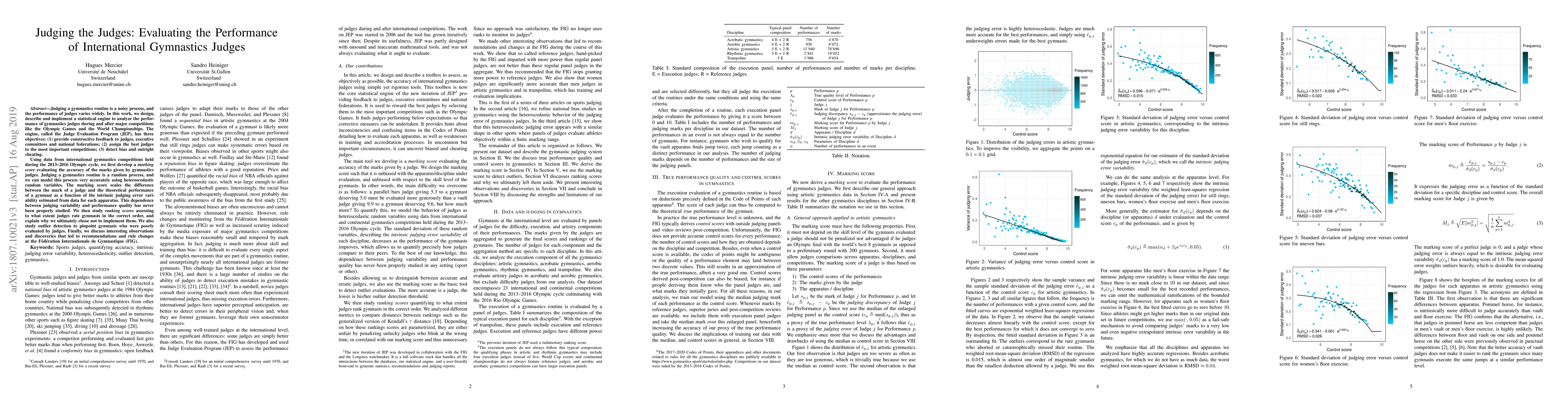 This research develops a statistical engine, the Judge Evaluation Program (JEP), to analyze gymnastics judges' performance, aiming to provide feedback, assign judges based on quality, and detect bias. The study uses data from 2013-2016 competitions to evaluate judges' accuracy and variability, leading to recommendations and rule changes.
