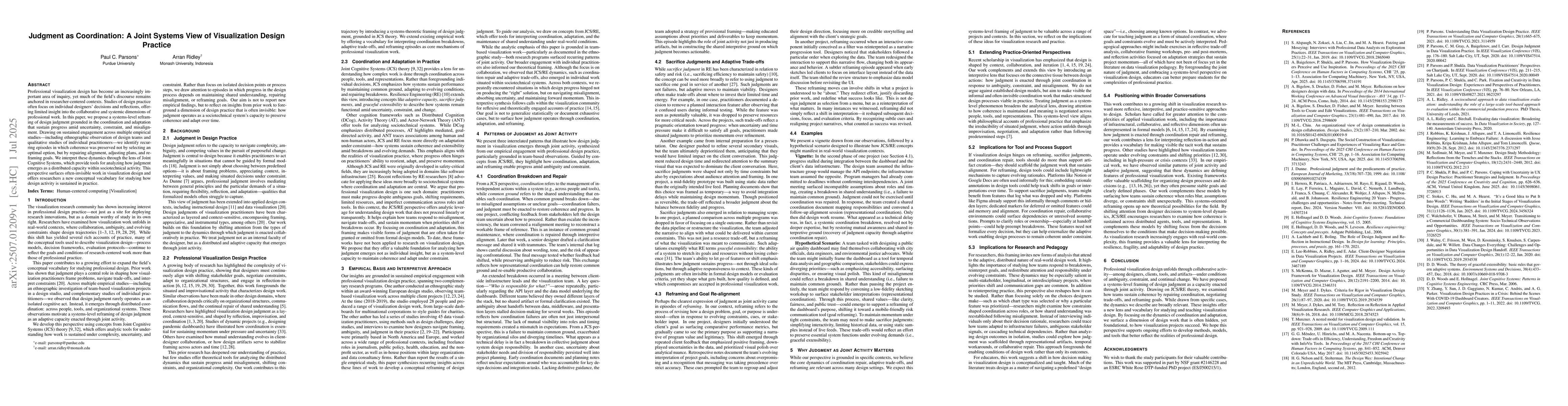 Professional visualization design has become an increasingly important area of inquiry, yet much of the field's discourse remains anchored in researcher-centered contexts. Studies of design practice often focus on individual designers' decisions and reflections, offering limited insight into the collaborative and systemic dimensions of professional work. In this paper, we propose a systems-level reframing of design judgment grounded in the coordination and adaptation that sustain progress amid uncertainty, constraint, and misalignment. Drawing on sustained engagement across multiple empirical studies--including ethnographic observation of design teams and qualitative studies of individual practitioners--we identify recurring episodes in which coherence was preserved not by selecting an optimal option, but by repairing alignment, adjusting plans, and reframing goals. We interpret these dynamics through the lens of Joint Cognitive Systems, which provide tools for analyzing how judgment emerges as a distributed capacity within sociotechnical activity. This perspective surfaces often-invisible work in visualization design and offers researchers a new conceptual vocabulary for studying how design activity is sustained in practice.