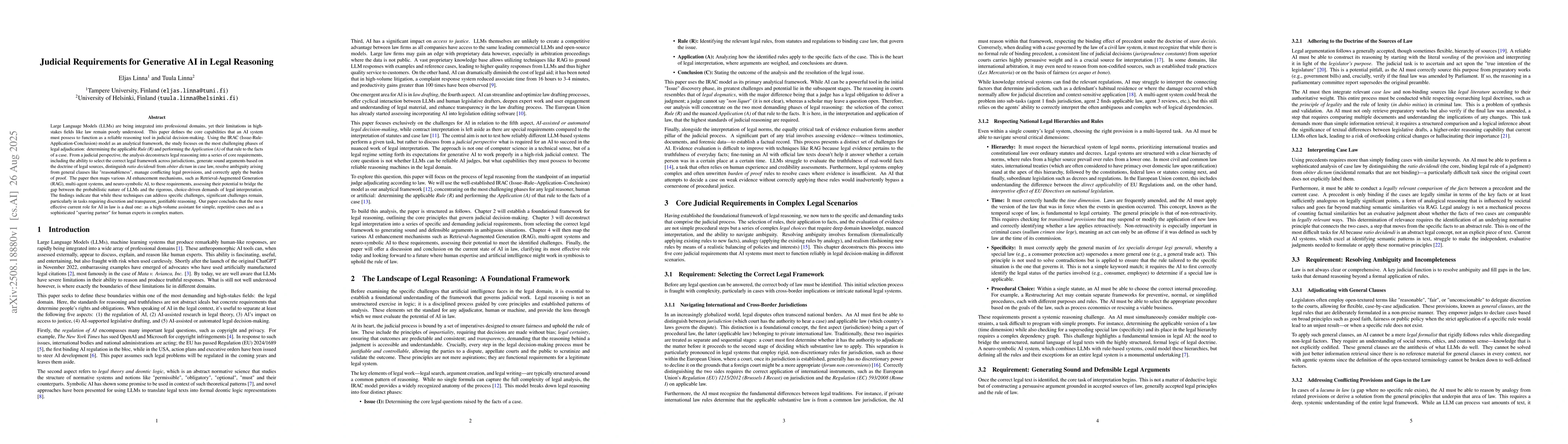 Large Language Models (LLMs) are being integrated into professional domains, yet their limitations in high-stakes fields like law remain poorly understood. This paper defines the core capabilities that an AI system must possess to function as a reliable reasoning tool in judicial decision-making. Using the IRAC (Issue-Rule-Application-Conclusion) model as an analytical framework, the study focuses on the most challenging phases of legal adjudication: determining the applicable Rule (R) and performing the Application (A) of that rule to the facts of a case. From a judicial perspective, the analysis deconstructs legal reasoning into a series of core requirements, including the ability to select the correct legal framework across jurisdictions, generate sound arguments based on the doctrine of legal sources, distinguish ratio decidendi from obiter dictum in case law, resolve ambiguity arising from general clauses like "reasonableness", manage conflicting legal provisions, and correctly apply the burden of proof. The paper then maps various AI enhancement mechanisms, such as Retrieval-Augmented Generation (RAG), multi-agent systems, and neuro-symbolic AI, to these requirements, assessing their potential to bridge the gap between the probabilistic nature of LLMs and the rigorous, choice-driven demands of legal interpretation. The findings indicate that while these techniques can address specific challenges, significant challenges remain, particularly in tasks requiring discretion and transparent, justifiable reasoning. Our paper concludes that the most effective current role for AI in law is a dual one: as a high-volume assistant for simple, repetitive cases and as a sophisticated "sparring partner" for human experts in complex matters.