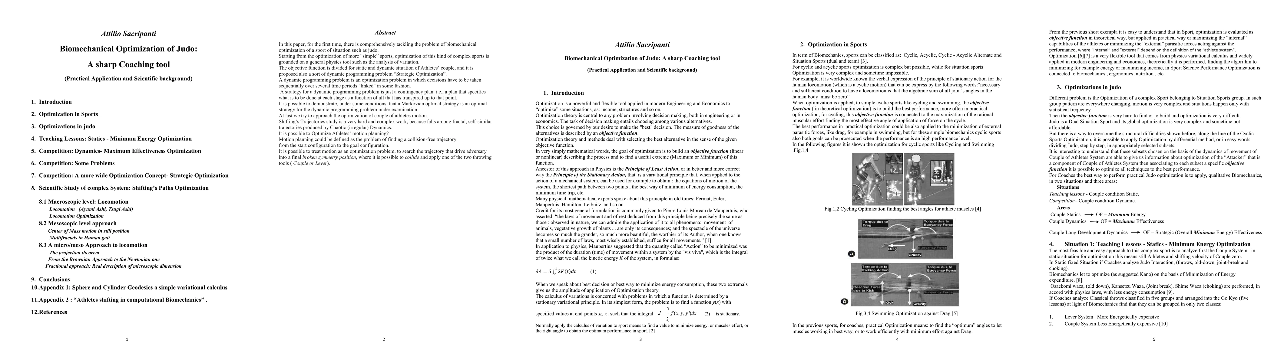 In this paper, for the first time, there is comprehensively tackling the problem of biomechanical optimization of a sport of situation such as judo. Starting from the optimization of more simple sports, optimization of this kind of complex sports is grounded on a general physics tool such as the analysis of variation. The objective function is divided for static and dynamic situation of Athletes couple, and it is proposed also a sort of dynamic programming problem Strategic Optimization. A dynamic programming problem is an optimization problem in which decisions have to be taken sequentially over several time periods linked in some fashion. A strategy for a dynamic programming problem is just a contingency plan, a plan that specifies what is to be done at each stage as a function of all that has transpired up to that point. It is possible to demonstrate, under some conditions, that a Markovian optimal strategy is an optimal strategy for the dynamic programming problem under examination. At last we try to approach the optimization of couple of athletes motion. Shifting s Trajectories study is a very hard and complex work, because falls among fractal, self similar trajectories produced by Chaotic, irregular, Dynamics. It is possible to Optimize Athletes motion planning. Motion planning could be defined as the problem of finding a collision free trajectory from the start configuration to the goal configuration. It is possible to treat motion as an optimization problem, to search the trajectory that drive adversary into a final broken symmetry position, where it is possible to collide and apply one of the two throwing tools: Couple or Lever.