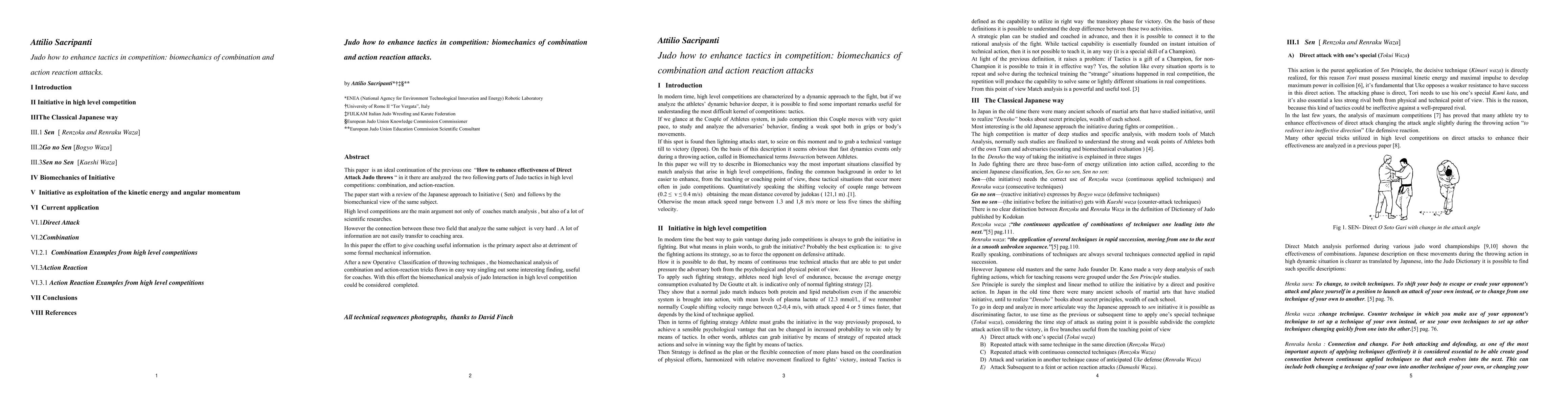 This paper is an ideal continuation of the previous one - How to enhance effectiveness of Direct Attack Judo throws -in it there are analyzed the two following parts of Judo tactics in high level competitions: combination, and action-reaction. The paper start with a review of the Japanese approach to Initiative ( Sen) and follows by the biomechanical view of the same subject. High level competitions are the main argument not only of coaches match analysis , but also of a lot of scientific researches. However the connection between these two field that analyze the same subject is very hard . A lot of information are not easily transfer to coaching area. In this paper the effort to give coaching useful information is the primary aspect also at detriment of some formal mechanical information. After a new Operative Classification of throwing techniques , the biomechanical analysis of combination and action-reaction tricks flows in easy way singling out some interesting finding, useful for coaches. With this effort the biomechanical analysis of judo Interaction in high level competition could be considered completed