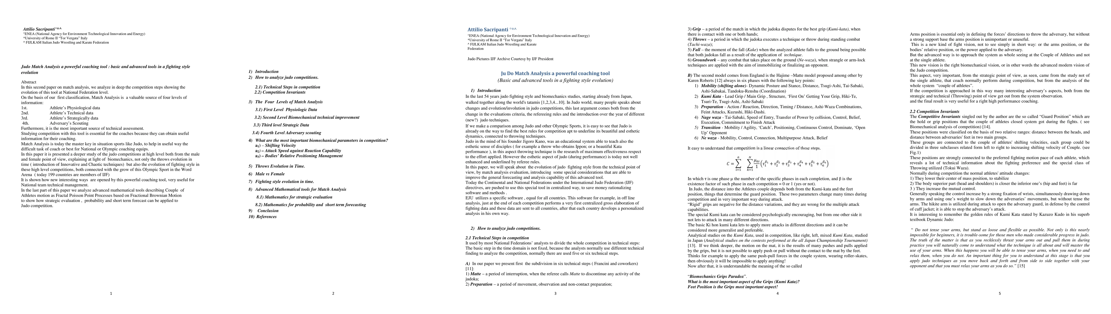 In this second paper on match analysis, we analyze in deep the competition steps showing the evolution of this tool at National Federation level.On the basis of our,first classification. Furthermore, it is the most important source of technical assessment. Studying competition with this tool is essential for the coaches because they can obtain useful information for their coaching. Match Analysis is today the master key in situation sports like Judo, to help in useful way the difficult task of coach or best for National or Olympic coaching equips. In this paper it is presented a deeper study of the judo competitions at high level both from the male and female point of view, explaining at light of biomechanics, not only the throws evolution in time, introduction of Innovative and Chaotic techniques, but also the evolution of fighting style in these high level competitions, both connected with the grow of this Olympic Sport in the Word Arena. It is shown how new interesting ways are opened by this powerful coaching tool, very useful for National team technical management.In the last part of this paper we analyze advanced mathematical tools describing Couple of Athletes motion as Fractal Poisson Point Processes based on Fractional Brownian Motion to show how strategic evaluation, probability and short term forecast can be applied to Judo competition.
