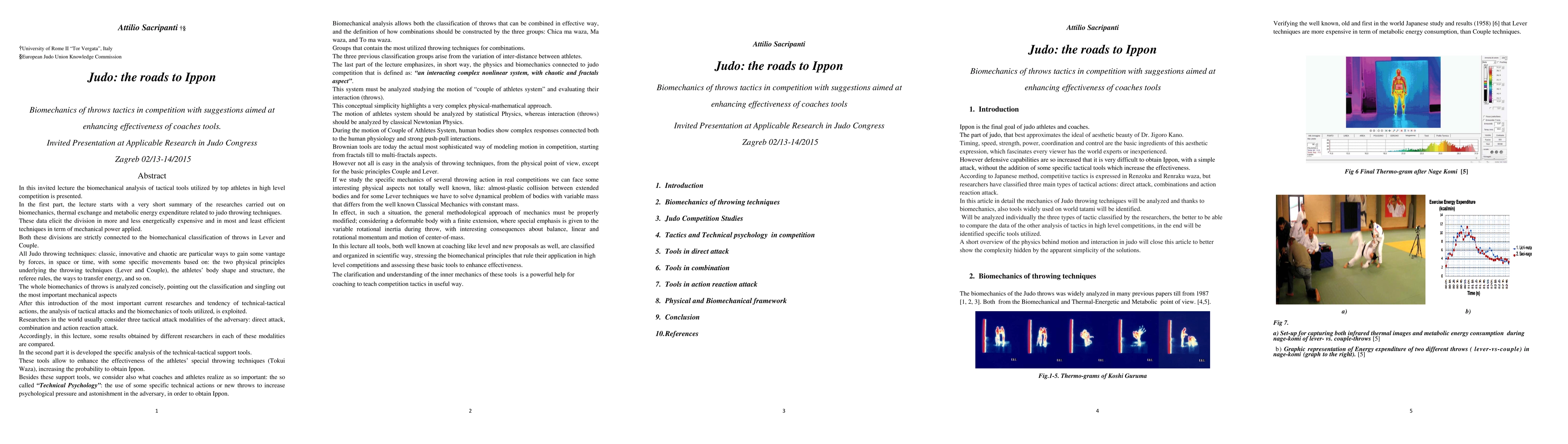 In this invited lecture the biomechanical analysis of tactical tools utilized by top athletes in high level competition is presented. In the first part, the lecture starts with a very short summary of the researches carried out on biomechanics, thermal exchange and metabolic energy expenditure related to judo throwing technique. In the second part it is developed the specific analysis of the technical tactical support tools.These tools allow to enhance the effectiveness of the athletes special throwing techniques,Tokui Waza,increasing the probability to obtain Ippon. The last part of the lecture emphasizes,the physics and biomechanics connected to judo competition that is defined as:an interacting complex nonlinear system, with chaotic and fractals aspect.This system must be analyzed studying the motion of couple of athletes system and evaluating their interaction,throws.Brownian tools are today the actual most sophisticated way of modeling motion in competition, starting from fractals till to multifractals aspects.If we study the specific mechanics of several throwing action in real competitions we can face some interesting physical aspects not totally well known, like almost plastic collision between extended bodies and for some Lever techniques we have to solve dynamical problem of bodies with variable mass that differs from the well known Classical Mechanics with constant mass. In effect, in such a situation,the general methodological approach of mechanics must be properly modified; considering a deformable body with a finite extension, where special emphasis is given to the variable rotational inertia during throw, with interesting consequences about balance, linear and rotational momentum and motion of center of mass.