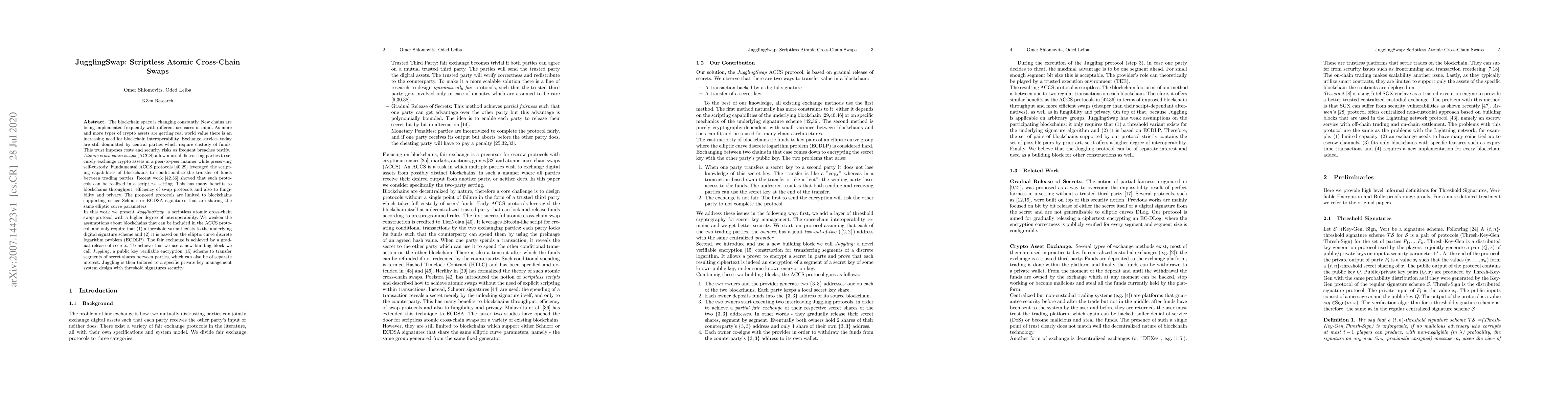 JugglingSwap introduces a scriptless atomic cross-chain swap protocol that enhances blockchain interoperability without requiring specific blockchain scripting capabilities, leveraging threshold signatures and a novel Juggling encryption scheme to facilitate secure, peer-to-peer asset exchanges.