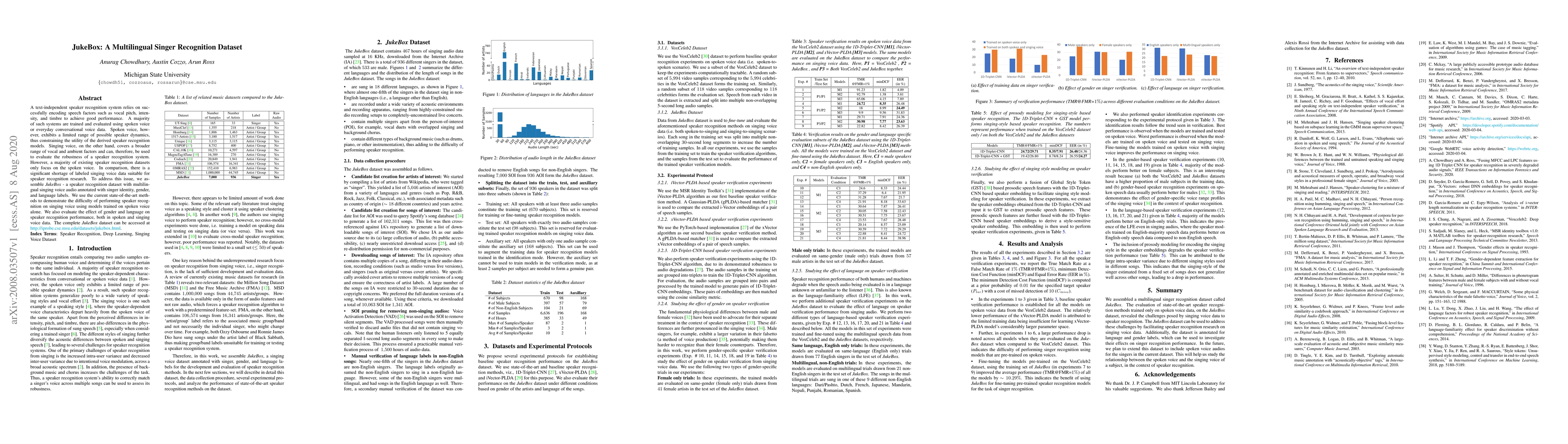 The paper introduces the JukeBox dataset, a multilingual singing voice recognition dataset with singer identity, gender, and language labels, and evaluates the performance of state-of-the-art speaker recognition methods on this dataset.