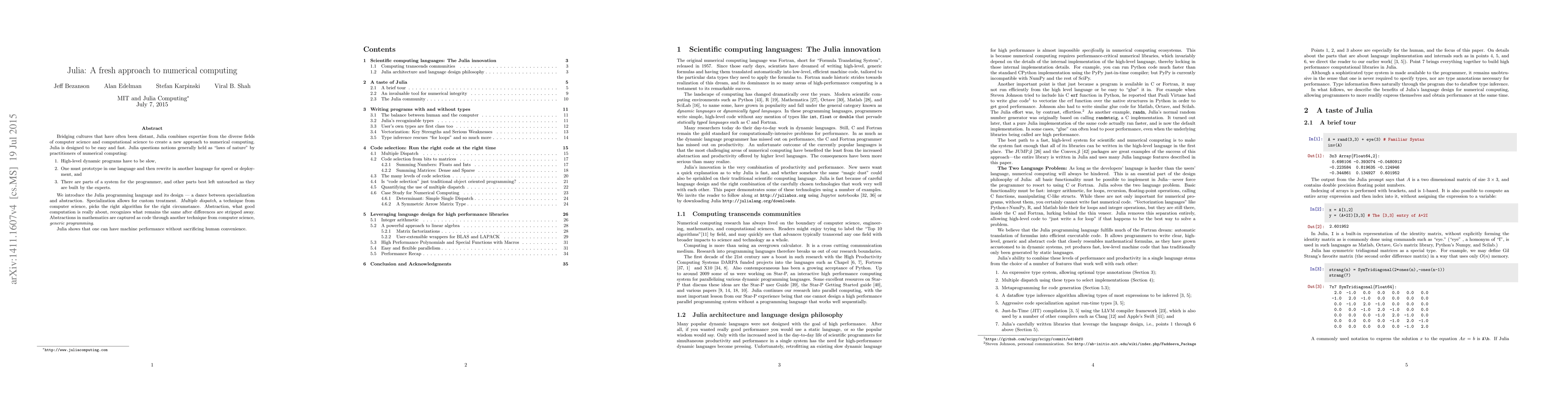 Julia is a new programming language that merges computer science and computational science to revolutionize numerical computing, challenging traditional beliefs about speed and ease of programming. It achieves high performance through techniques like multiple dispatch and generic programming while maintaining user-friendly abstractions.