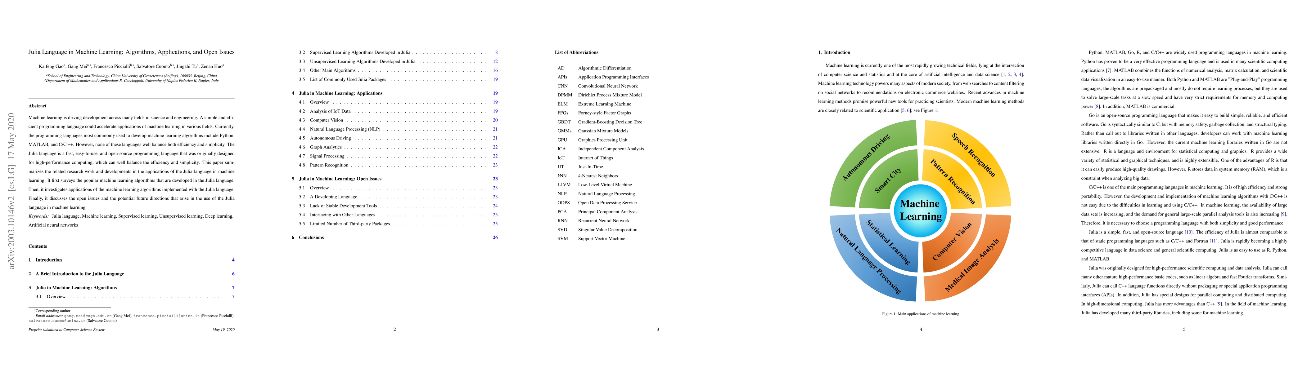 This paper explores the use of the Julia language in machine learning, highlighting its balance of efficiency and simplicity. It surveys popular machine learning algorithms developed in Julia, investigates their applications, and discusses open issues and future directions for the language in this field.