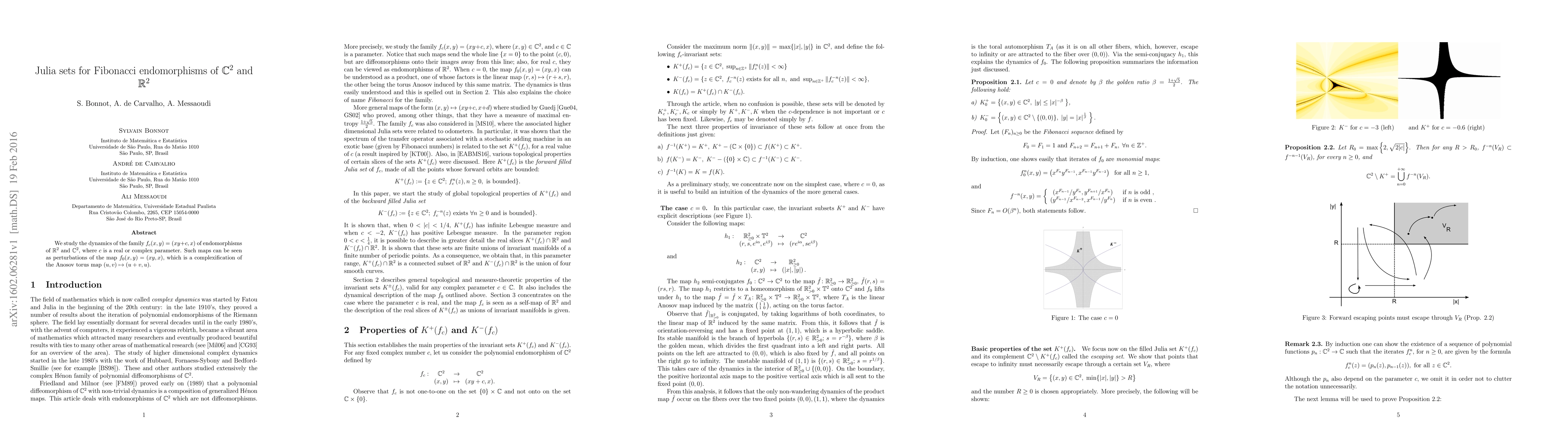 We study the dynamics of the family $f_c(x, y)= (xy+c, x)$ of endomorphisms of $\mathbb{R}^2$ and $\mathbb{C}^2$, where $c$ is a real or complex parameter. Such maps can be seen as perturbations of the map $f_0(x,y)=(xy,x)$, which is a complexification of the Anosov torus map $(u,v) \mapsto (u+v,u)$.