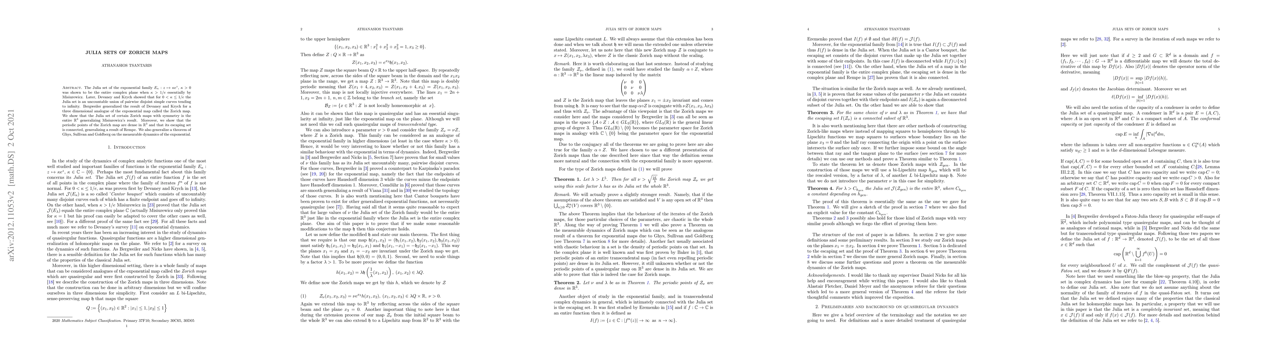 The paper introduces a method for analyzing the Julia sets of Zorich maps, extending known results from exponential families to ∑R^3, and proves properties of their periodic points and escaping sets.