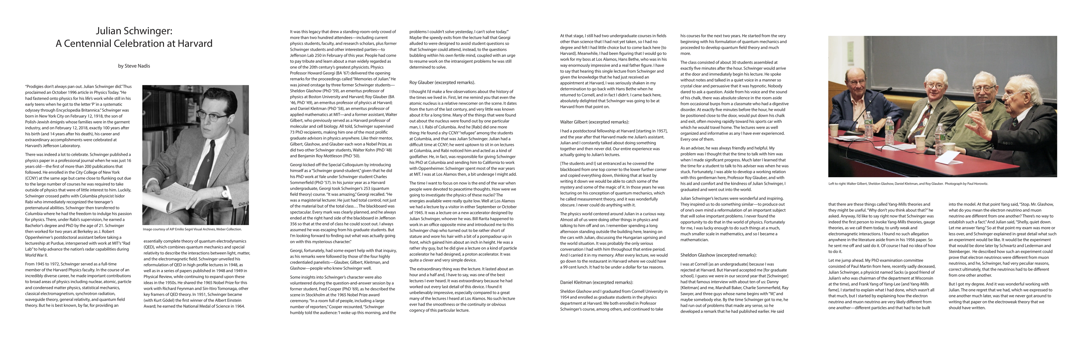 This paper provides a biographical overview of theoretical physicist Julian Schwinger and details the "Memories of Julian" Centennial Celebration held at Harvard University on February 12, 2018, commemorating his contributions to physics.