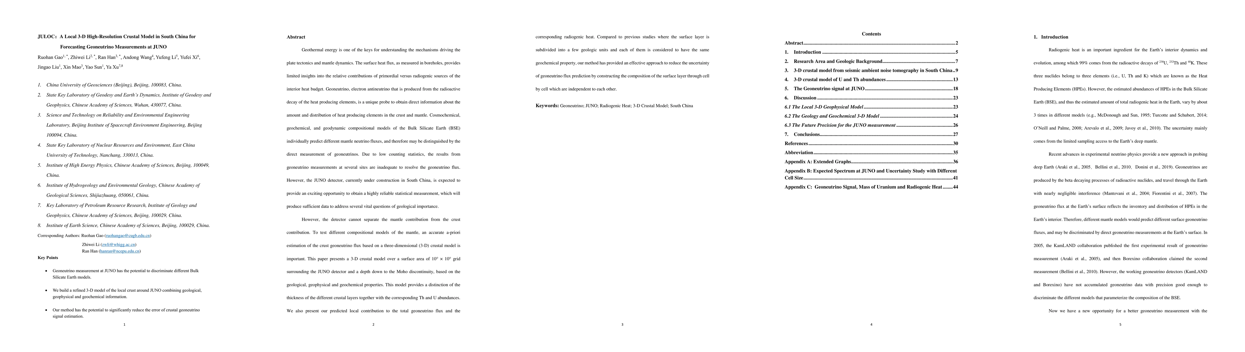 This paper presents a refined 3-D crust model, JULOC, for the Jiangmen Underground Neutrino Observatory (JUNO) to estimate geoneutrino flux and radiogenic heat, crucial for distinguishing different compositional models of the Earth's mantle. The model, based on geological, geophysical, and geochemical properties, provides detailed Th and U abundances and predicts local contributions to the geoneutrino flux.