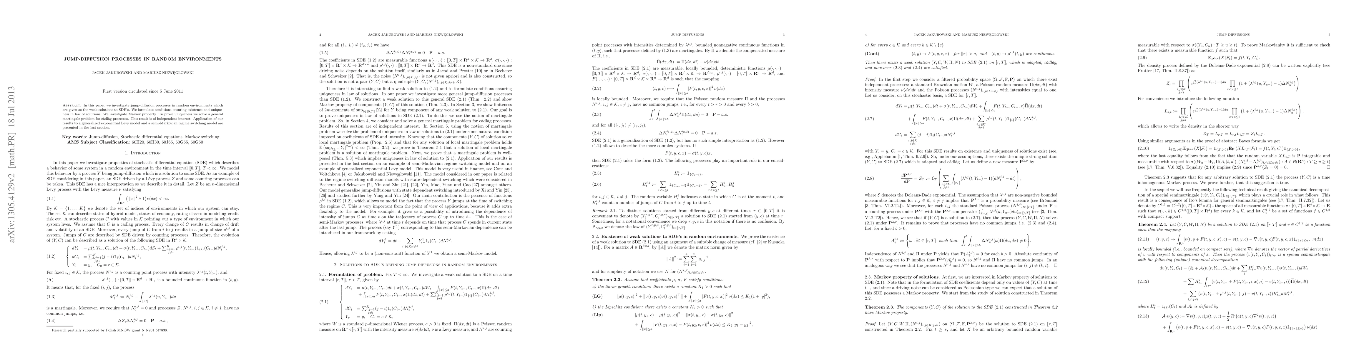 The paper investigates jump-diffusion processes in random environments, formulating conditions for the existence and uniqueness in law of solutions, and proving the Markov property. It solves a general martingale problem for \(\cadlag\) processes to prove uniqueness.