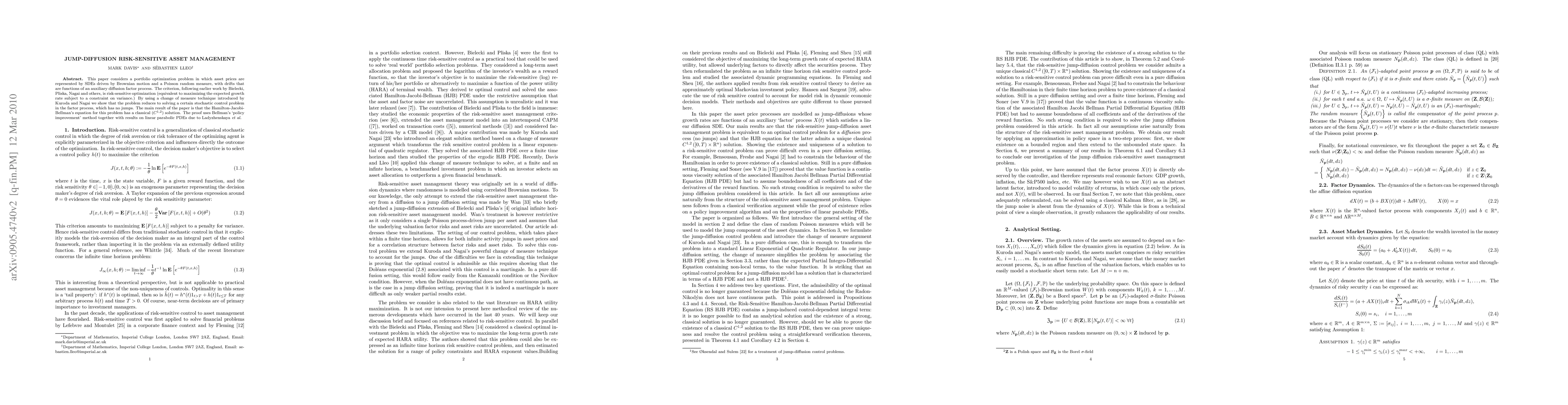 This paper optimizes portfolios where asset prices follow jump-diffusion SDEs, employing risk-sensitive criteria. The problem is simplified using a change of measure, leading to a stochastic control problem solvable via a classical Hamilton-Jacobi-Bellman equation, proven using Bellman’s method and PDE results.