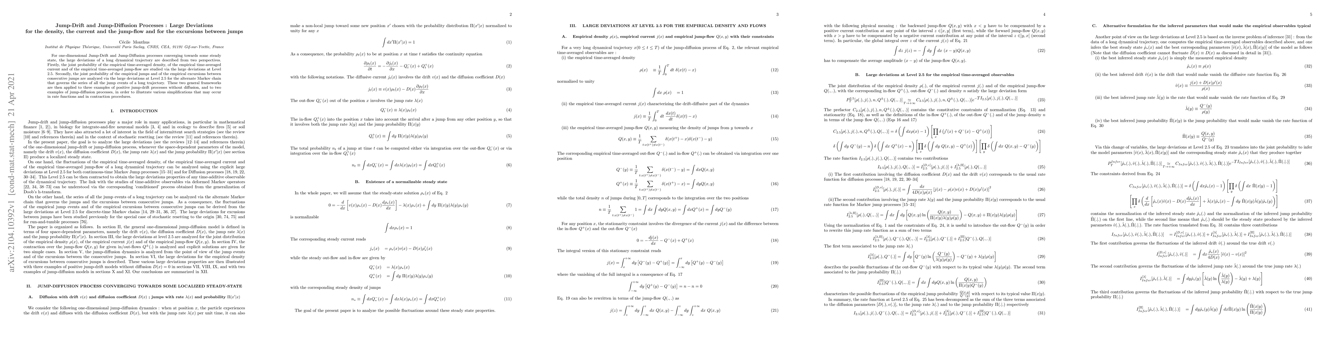 This paper studies large deviations for one-dimensional Jump-Drift and Jump-Diffusion processes, focusing on the joint probabilities of density, current, and jump-flow, as well as the probabilities of jumps and inter-jump intervals. It applies these frameworks to various examples to demonstrate simplifications in rate functions.