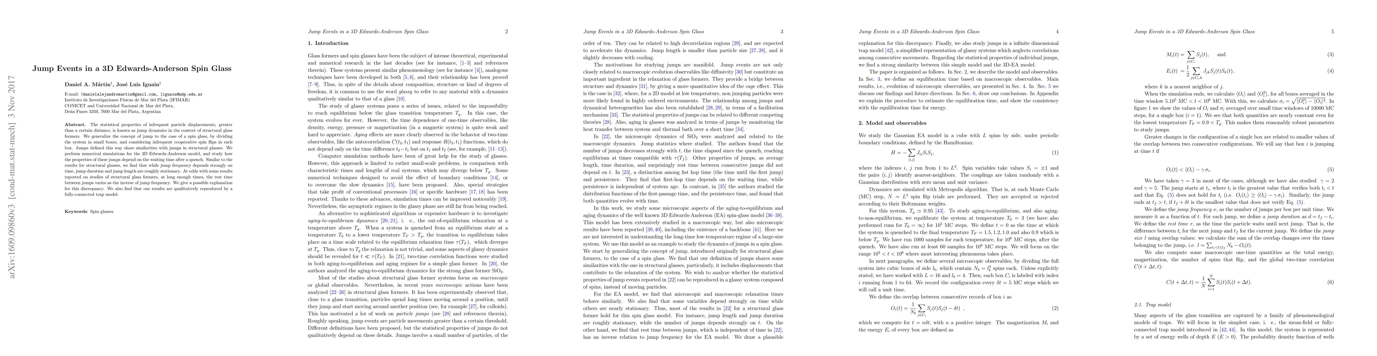 Researchers studied jump dynamics in a 3D spin glass model, finding that jump frequency increases with time but duration and length remain relatively constant, contrasting with previous findings on structural glasses.