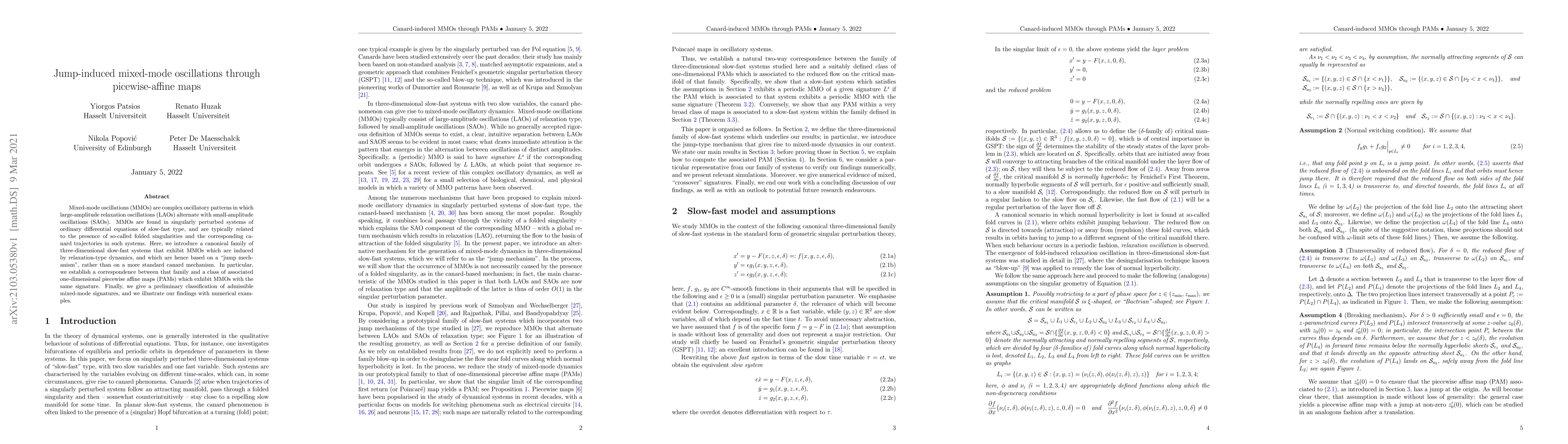 This paper explores mixed-mode oscillations (MMOs) in three-dimensional slow-fast systems induced by a "jump mechanism" rather than canard trajectories. It establishes a connection between these systems and one-dimensional piecewise-affine maps, providing a preliminary classification of MMO signatures and illustrating findings with numerical examples.