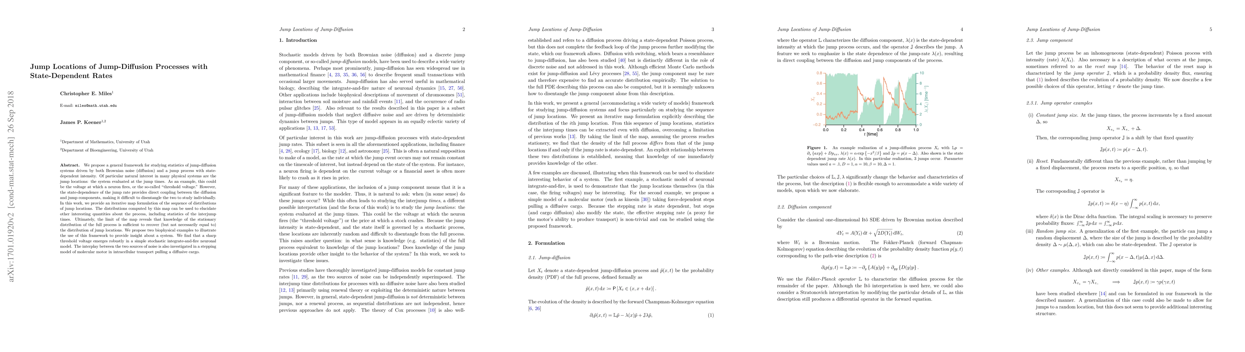 This paper develops a framework for analyzing jump-diffusion processes with state-dependent jump rates, providing an iterative map for the distributions of jump locations and revealing a relationship between interjump time statistics and the stationary density of the process. The study demonstrates analytical and numerical tools, including a non-monotonic dependence on the strength of diffusion.
