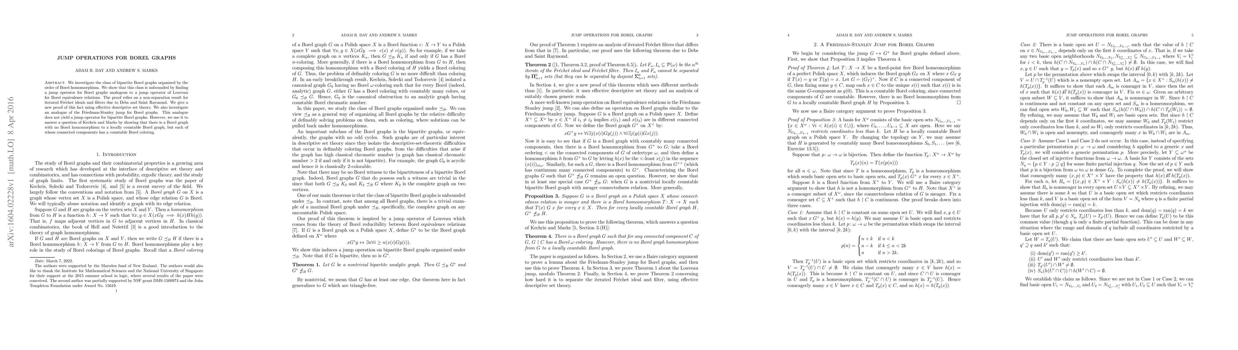 We investigate the class of bipartite Borel graphs organized by the order of Borel homomorphism. We show that this class is unbounded by finding a jump operator for Borel graphs analogous to a jump operator of Louveau for Borel equivalence relations. The proof relies on a non-separation result for iterated Frechet ideals and filters due to Debs and Saint Raymond. We give a new proof of this fact using effective descriptive set theory. We also investigate an analogue of the Friedman-Stanley jump for Borel graphs. This analogue does not yield a jump operator for bipartite Borel graphs. However, we use it to answer a question of Kechris and Marks by showing that there is a Borel graph with no Borel homomorphism to a locally countable Borel graph, but each of whose connected components has a countable Borel coloring.