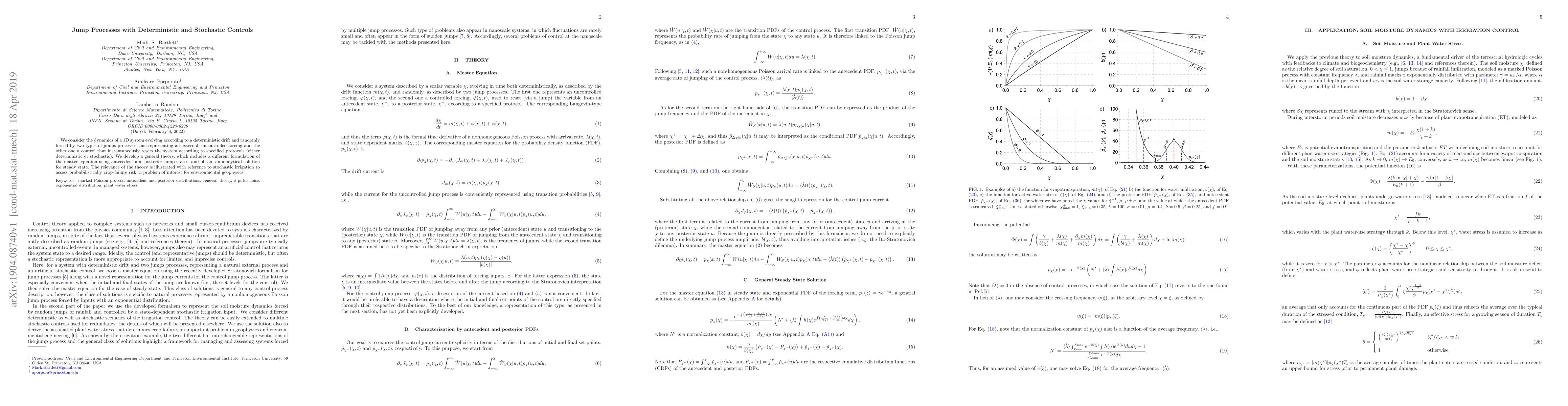 This paper develops a theory for a 1D system influenced by deterministic drift and two types of jump processes, one external and one controlled. It formulates a master equation and provides an analytical steady-state solution, demonstrating its relevance through an application to probabilistic crop-failure risk assessment in stochastic irrigation.