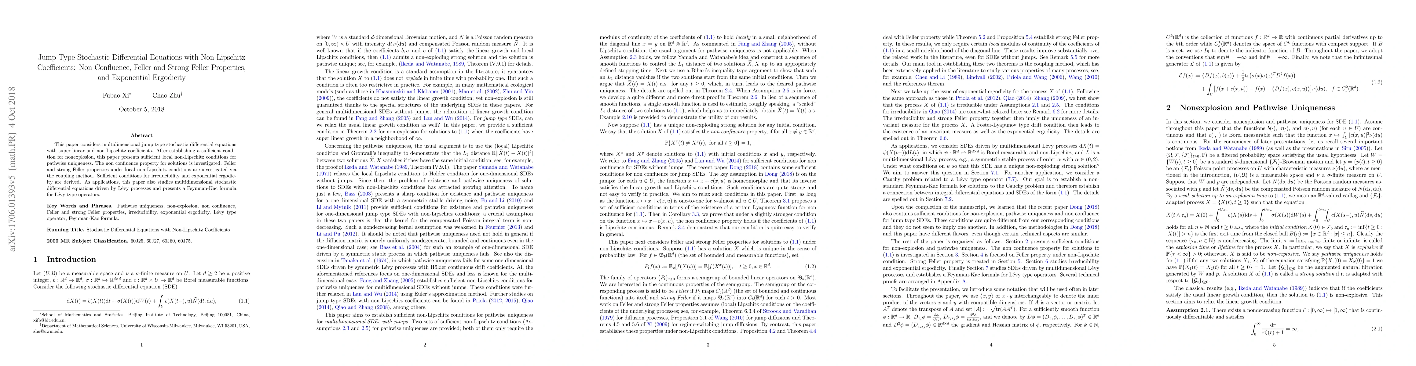 This paper investigates multidimensional jump type stochastic differential equations with non-Lipschitz coefficients, establishing sufficient conditions for nonexplosion and pathwise uniqueness. It explores Feller and strong Feller properties and derives conditions for irreducibility and exponential ergodicity.