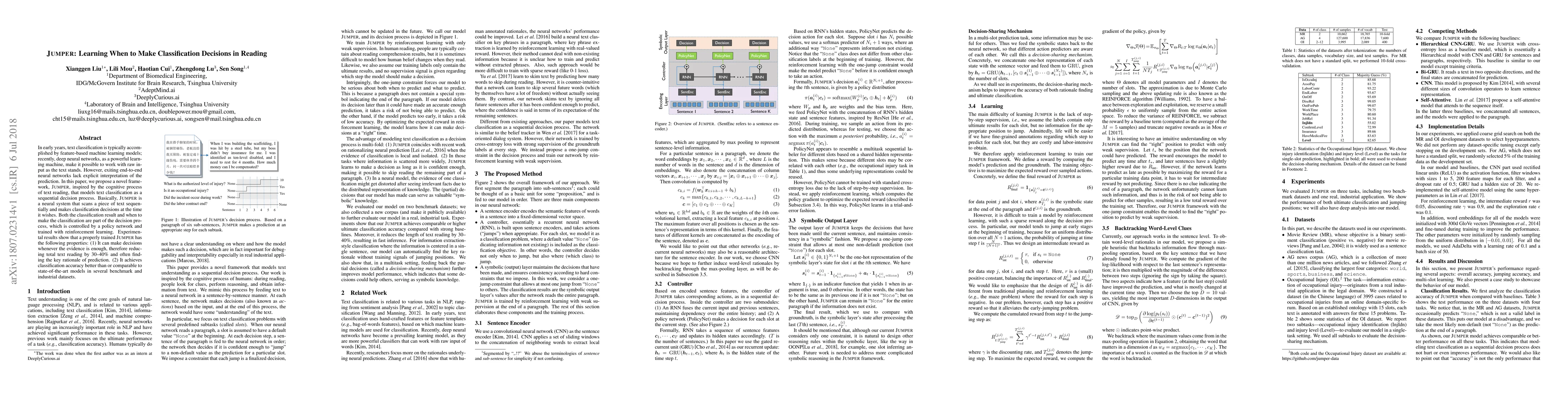In early years, text classification is typically accomplished by feature-based machine learning models; recently, deep neural networks, as a powerful learning machine, make it possible to work with raw input as the text stands. However, exiting end-to-end neural networks lack explicit interpretation of the prediction. In this paper, we propose a novel framework, JUMPER, inspired by the cognitive process of text reading, that models text classification as a sequential decision process. Basically, JUMPER is a neural system that scans a piece of text sequentially and makes classification decisions at the time it wishes. Both the classification result and when to make the classification are part of the decision process, which is controlled by a policy network and trained with reinforcement learning. Experimental results show that a properly trained JUMPER has the following properties: (1) It can make decisions whenever the evidence is enough, therefore reducing total text reading by 30-40% and often finding the key rationale of prediction. (2) It achieves classification accuracy better than or comparable to state-of-the-art models in several benchmark and industrial datasets.