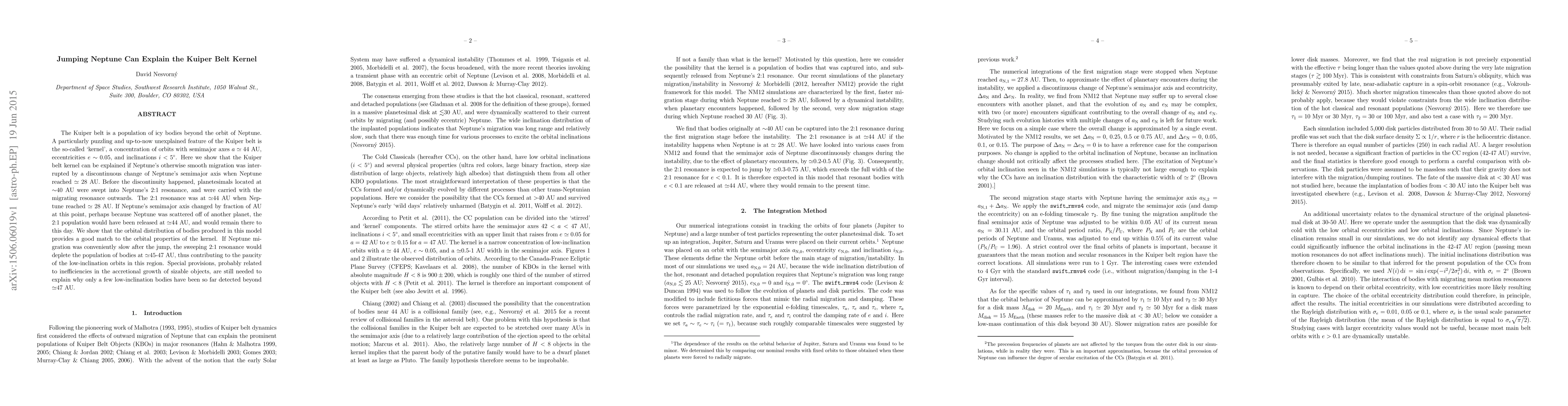 The Kuiper belt's "kernel" of orbits at ~44 AU can be explained by a sudden jump in Neptune's migration, releasing planetesimals from a 2:1 resonance and preserving them at this distance. This model also accounts for the scarcity of low-inclination orbits beyond ~47 AU due to resonance sweeping.