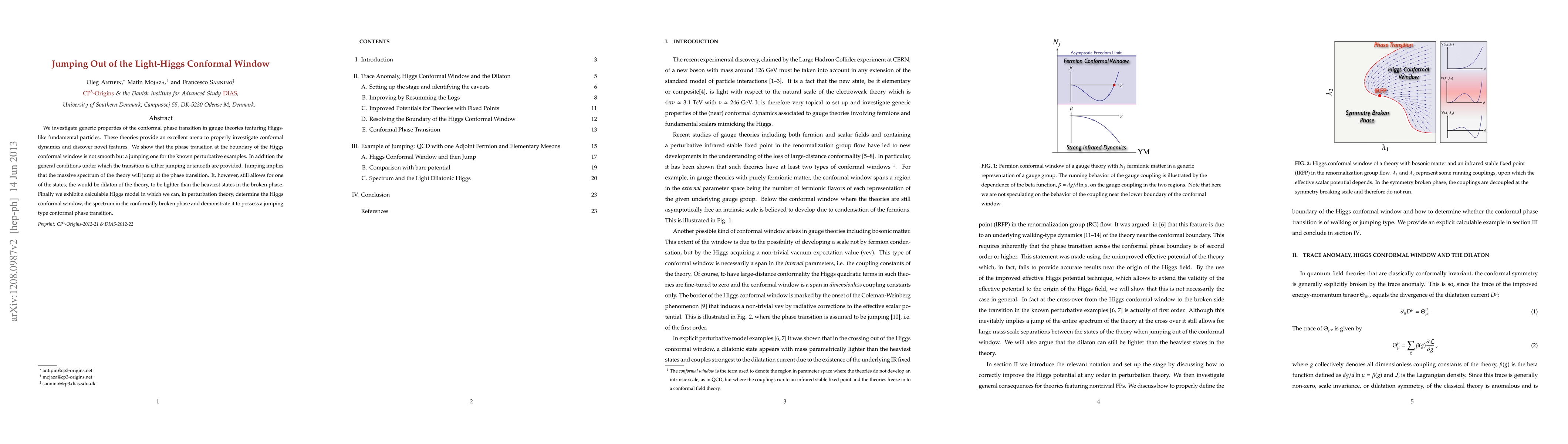 This paper explores the nature of the conformal phase transition in gauge theories with Higgs-like particles, revealing that the transition at the boundary of the Higgs conformal window is non-smooth or "jumping." It provides conditions for such transitions and demonstrates a calculable model showing a jumping transition, where the massive spectrum changes abruptly, yet one lighter state remains.