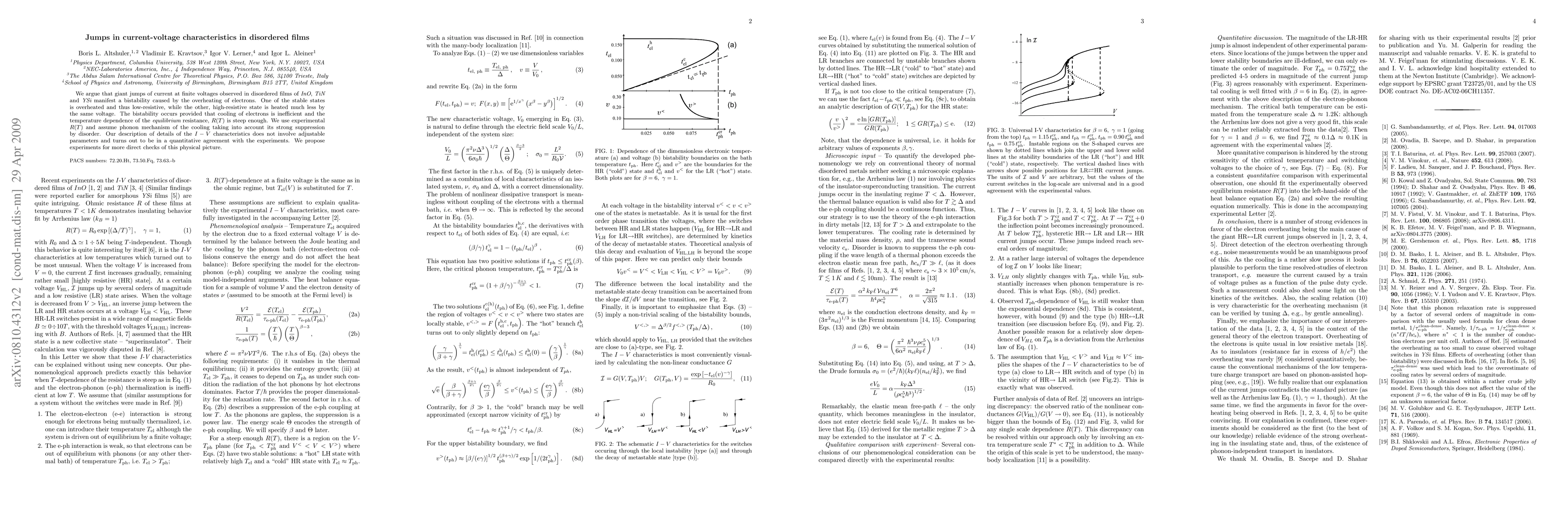 We argue that giant jumps of current at finite voltages observed in disordered samples of InO, TiN and YSi manifest a bistability caused by the overheating of electrons. One of the stable states is overheated and thus low-resistive, while the other, high-resistive state is heated much less by the same voltage. The bistability occurs provided that cooling of electrons is inefficient and the temperature dependence of the equilibrium resistance, R(T), is steep enough. We use experimental R(T) and assume phonon mechanism of the cooling taking into account its strong suppression by disorder. Our description of details of the I-V characteristics does not involve adjustable parameters and turns out to be in a quantitative agreement with the experiments. We propose experiments for more direct checks of this physical picture.