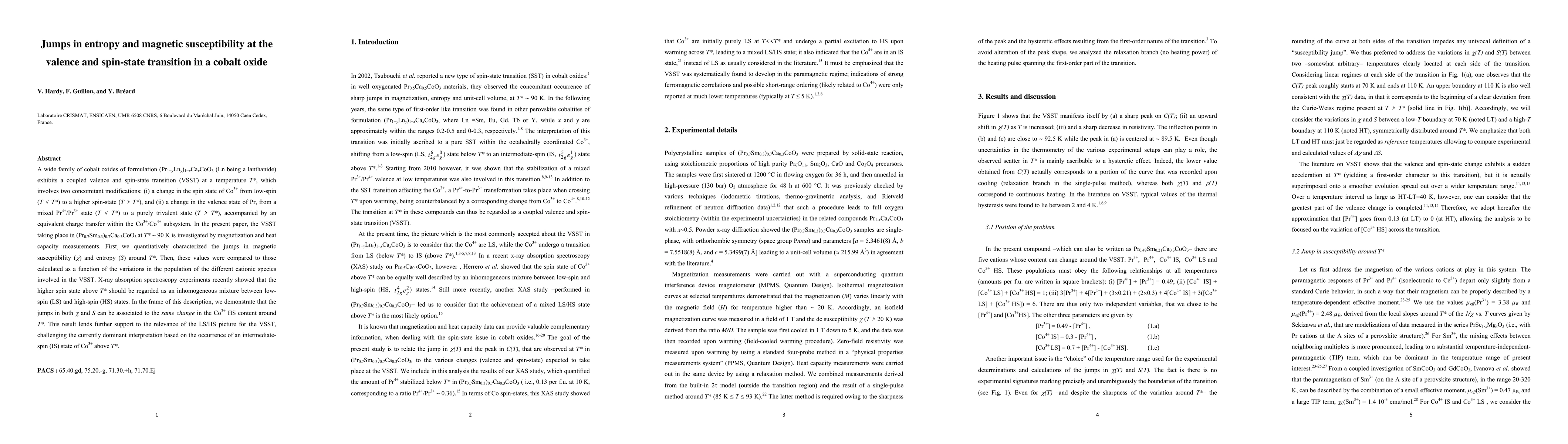 A wide family of cobalt oxides of formulation (Pr,Ln,Ca)CoO3 (Ln being a lanthanide) exhibits a coupled valence and spin-state transition (VSST) at a temperature T*, which involves two concomitant modifications: (i) a change in the spin state of Co3+ from low-spin (T < T*) to a higher spin-state (T > T*), and (ii) a change in the valence state of Pr, from a mixed Pr4+/Pr3+ state (T < T*) to a purely trivalent state (T > T*), accompanied by an equivalent charge transfer within the Co3+/Co4+ subsystem. In the present paper, the VSST taking place in (Pr0.7Sm0.3)0.7Ca0.3CoO3 at T* = about 90 K is investigated by magnetization and heat capacity measurements. First, we quantitatively characterized the jumps in magnetic susceptibility (khi) and entropy (S) around T*. Then, these values were compared to those calculated as a function of the variations in the population of the different cationic species involved in the VSST. X-ray absorption spectroscopy experiments recently showed that the higher spin state above T* should be regarded as an inhomogeneous mixture between low-spin (LS) and high-spin (HS) states. In the frame of this description, we demonstrate that the jumps in both khi and S can be associated to the same change in the Co3+ HS content around T*. This result lends further support to the relevance of the LS/HS picture for the VSST, challenging the currently dominant interpretation based on the occurrence of an intermediate-spin (IS) state of Co3+ above T*.