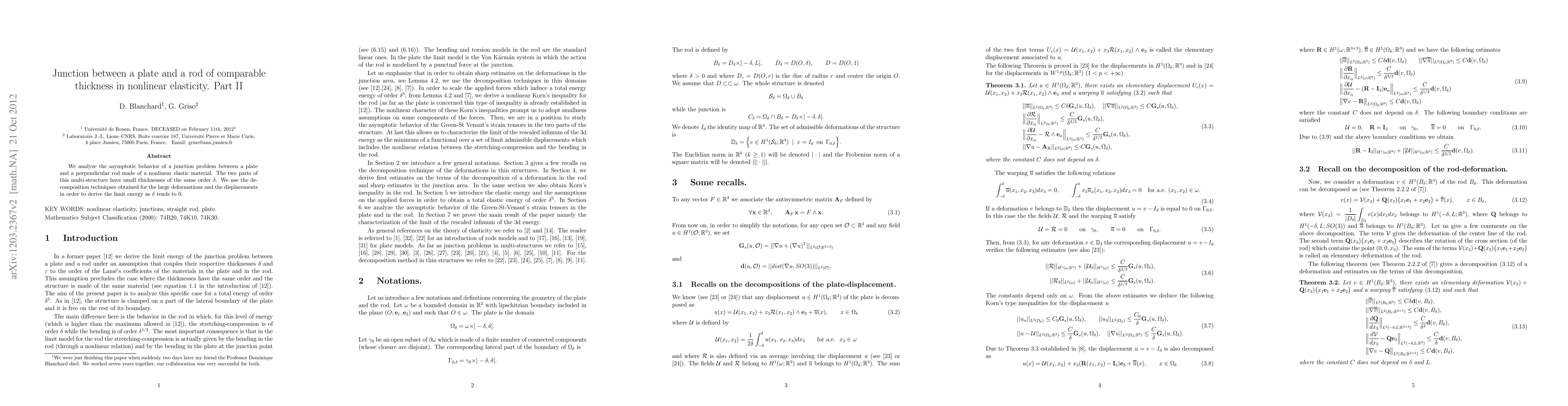 We analyze the asymptotic behavior of a junction problem between a plate and a perpendicular rod made of a nonlinear elastic material. The two parts of this multi-structure have small thicknesses of the same order $\delta$. We use the decomposition techniques obtained for the large deformations and the displacements in order to derive the limit energy as $\delta$ tends to 0.