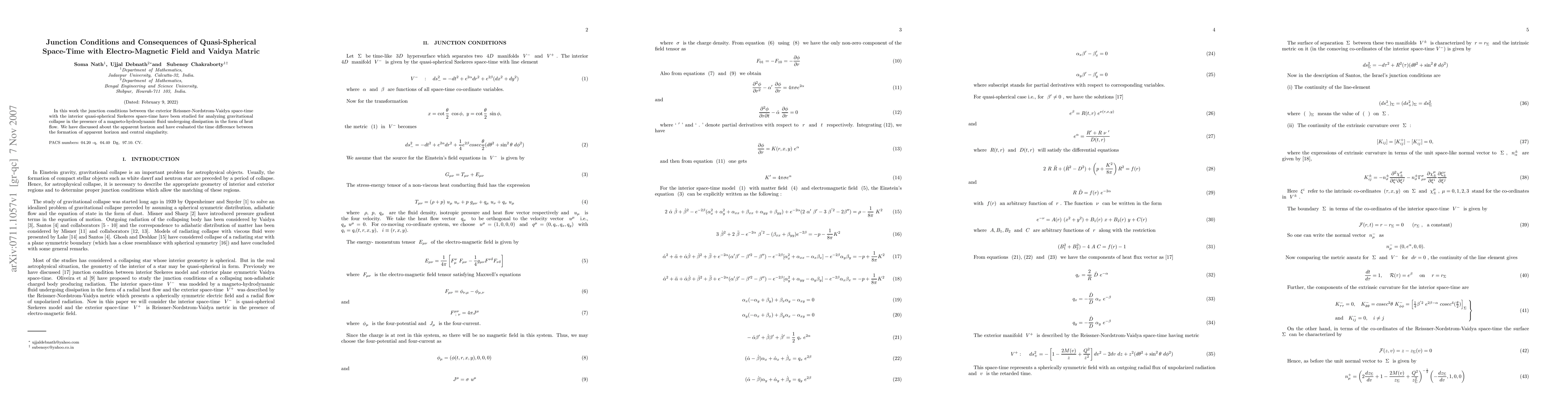 Researchers studied junction conditions between two types of space-time models to analyze gravitational collapse with a magneto-hydrodynamic fluid. They found the time difference between apparent horizon formation and central singularity.