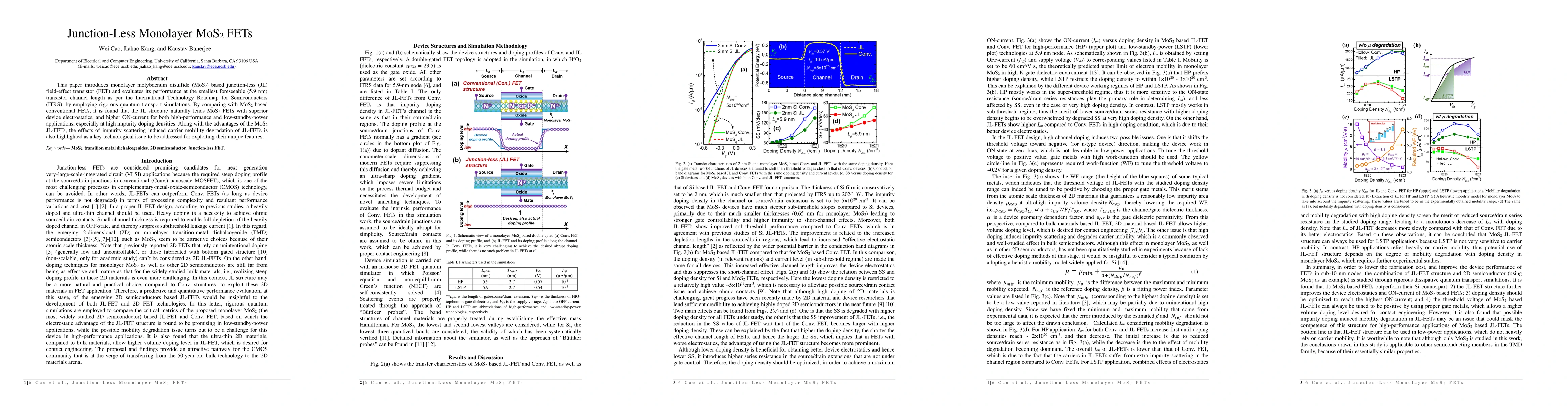 This paper evaluates junction-less monolayer MoS2 FETs at a 5.9 nm channel length, finding superior electrostatics and higher ON-current compared to conventional FETs, though it also notes impurity scattering as a significant challenge.
