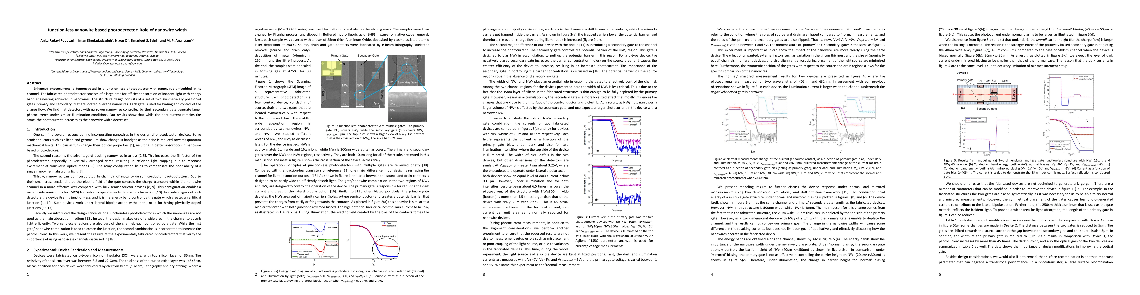 This research presents a junction-less photodetector utilizing nanowires, where narrower nanowires controlled by a secondary gate generate larger photocurrents under similar light exposure, while dark currents remain constant.