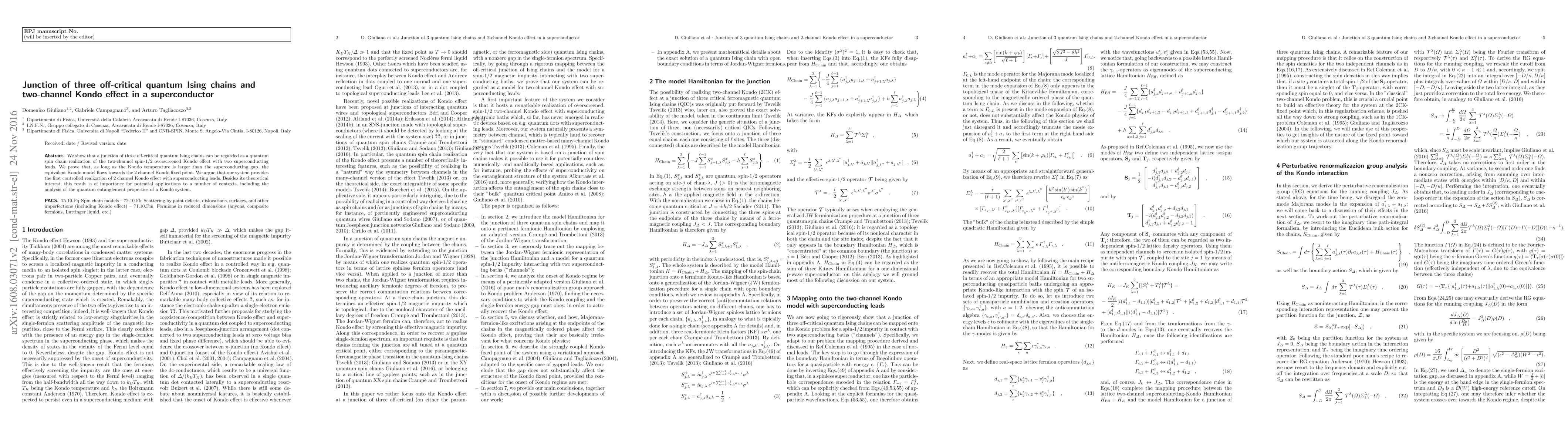 This paper demonstrates that a junction of three off-critical quantum Ising chains can realize the two-channel spin-1/2 overscreened Kondo effect with superconducting leads, showing that the system flows towards the two-channel Kondo fixed point when the Kondo temperature exceeds the superconducting gap. This provides a controlled realization of the two-channel Kondo effect with superconducting leads, with potential applications in quantum entanglement analysis.