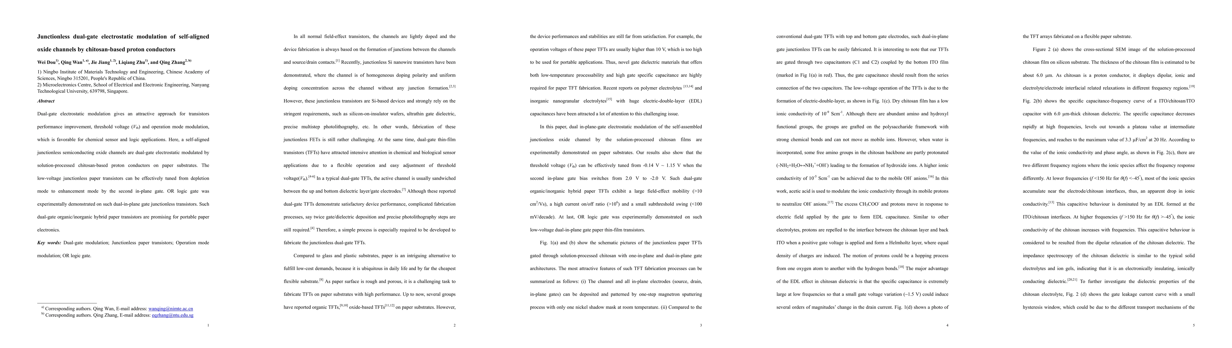 This paper explores dual-gate electrostatic modulation of self-aligned oxide channels using chitosan-based proton conductors, enabling low-voltage operation and transition from depletion to enhancement mode. The demonstrated OR logic gate on these hybrid paper transistors highlights their potential for portable paper electronics applications.