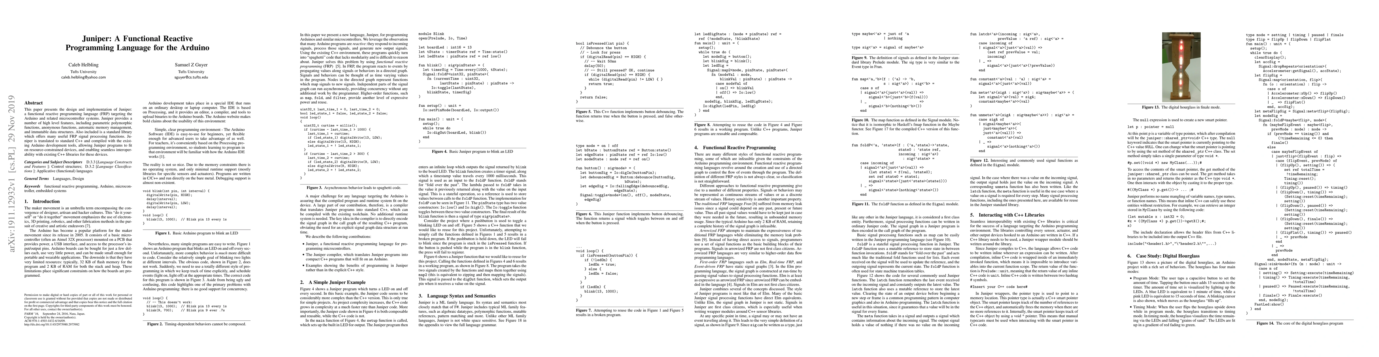 The paper presents the design and implementation of Juniper, a functional reactive programming language targeting Arduino and similar microcontroller systems, which is translated to C++ and compiled using existing Arduino development tools.