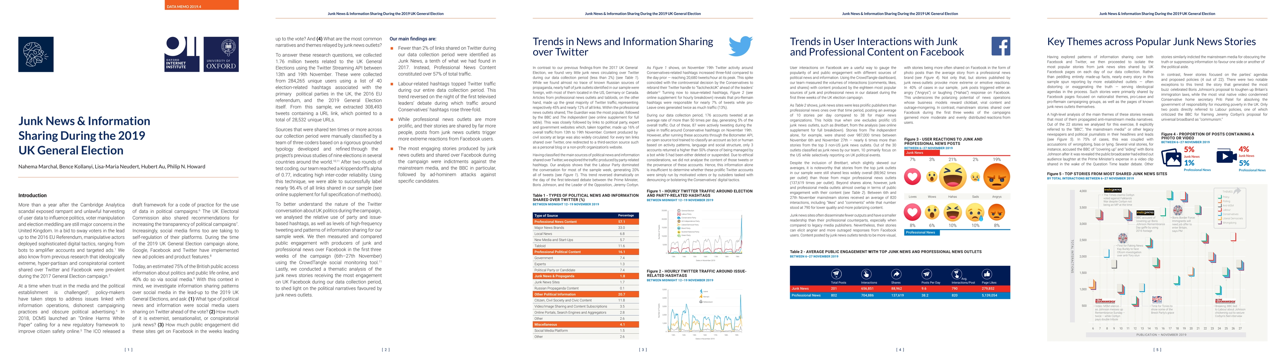 Summary: This study examines social media information sharing in the 2019 UK General Election, focusing on the prevalence of junk news on Twitter and Facebook. It finds that a significant portion of shared political content was extremist, sensationalist, or conspiratorial, with notable public engagement on Facebook, highlighting prevalent narratives and themes from junk news outlets.