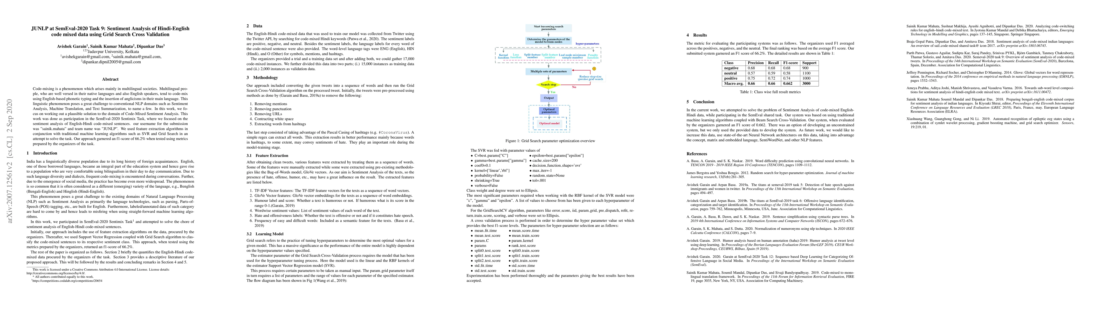 This paper presents a solution for sentiment analysis of English-Hindi code-mixed sentences, developed by the JUNLP team for SemEval-2020 Task 9. The approach utilizes feature extraction and traditional machine learning algorithms, achieving an f1-score of 66.2% through Grid Search Cross Validation.