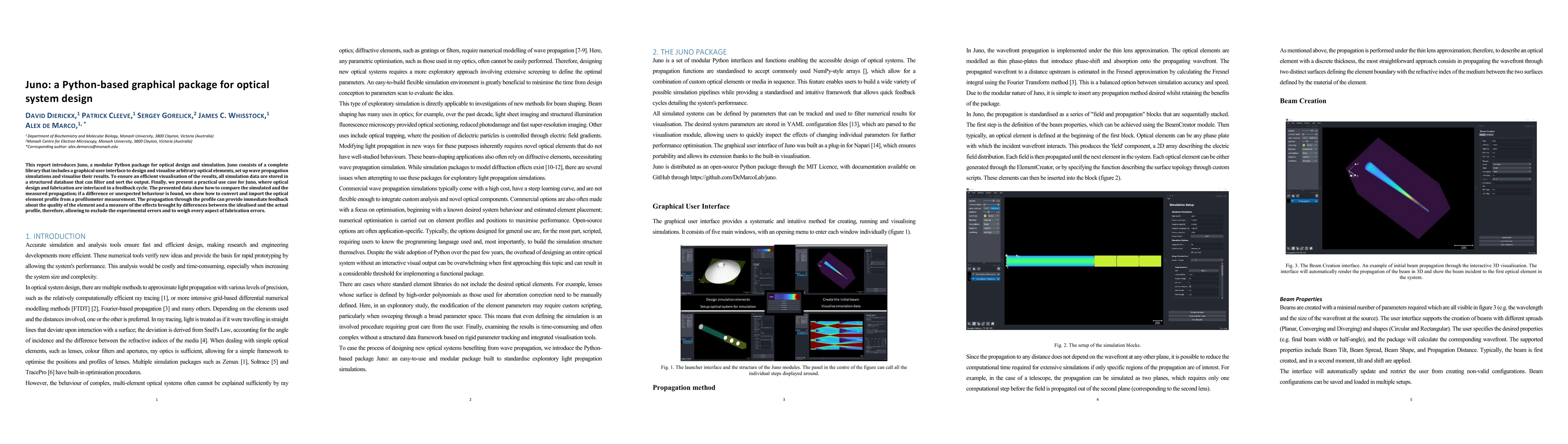 Juno is a Python-based graphical package for optical system design and simulation, featuring a modular library with a GUI for visualizing optical elements and wave propagation simulations. It includes a structured database for efficient data management and demonstrates practical use in iterative design and fabrication feedback cycles.