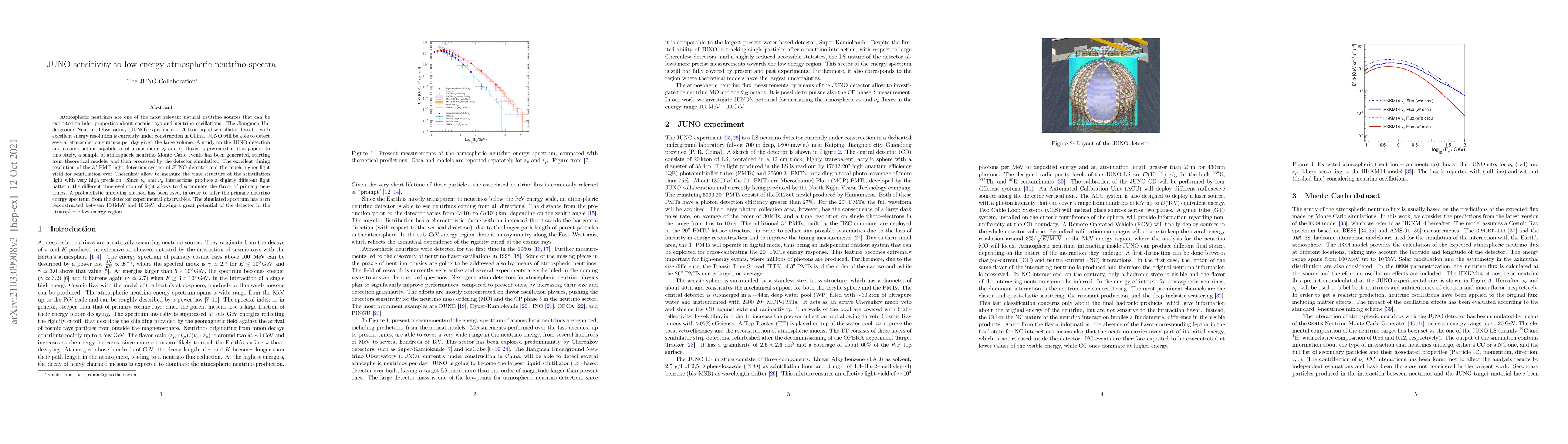 The JUNO experiment, a large liquid scintillator detector, demonstrates high sensitivity to low energy atmospheric neutrino spectra, enabling precise discrimination between $\nu_e$ and $\nu_\mu$ flavors through detailed light pattern analysis. The study shows JUNO's potential to reconstruct the primary neutrino energy spectrum in the range of 100 MeV to 10 GeV.