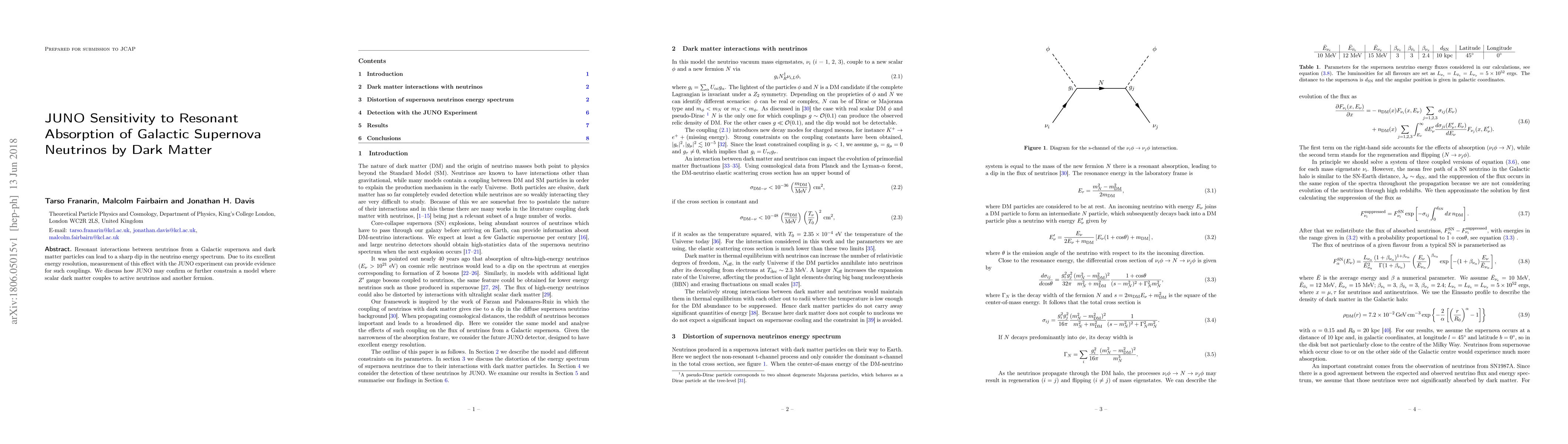 The JUNO experiment, with its high energy resolution, can detect a sharp dip in the neutrino energy spectrum from a Galactic supernova due to resonant absorption by dark matter, potentially confirming or constraining models of scalar dark matter coupling with active neutrinos and another fermion. This measurement could provide significant evidence for such interactions.