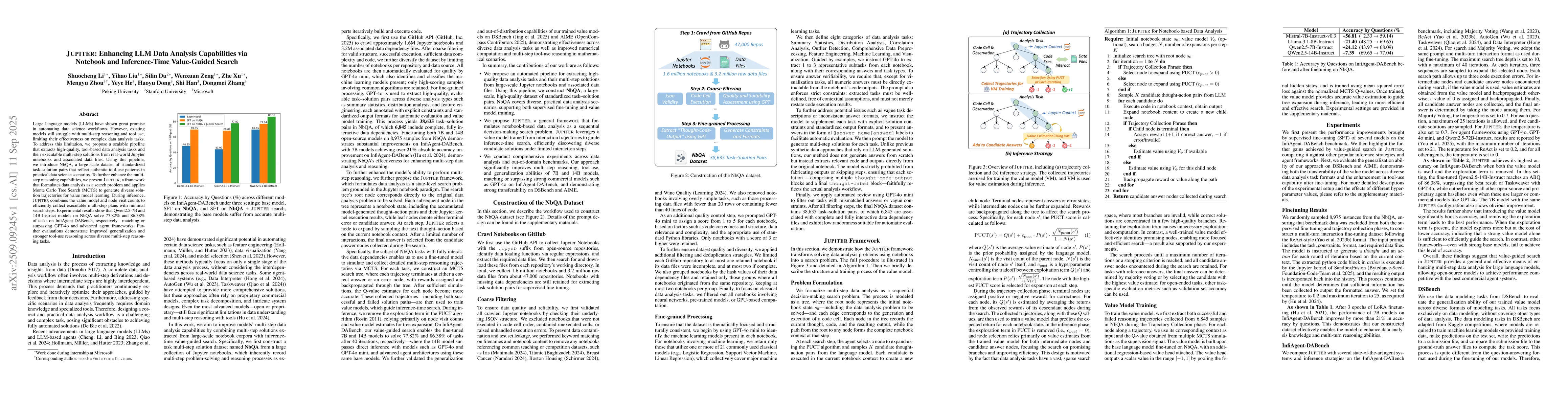 Large language models (LLMs) have shown great promise in automating data science workflows, but existing models still struggle with multi-step reasoning and tool use, which limits their effectiveness on complex data analysis tasks. To address this, we propose a scalable pipeline that extracts high-quality, tool-based data analysis tasks and their executable multi-step solutions from real-world Jupyter notebooks and associated data files. Using this pipeline, we introduce NbQA, a large-scale dataset of standardized task-solution pairs that reflect authentic tool-use patterns in practical data science scenarios. To further enhance multi-step reasoning, we present Jupiter, a framework that formulates data analysis as a search problem and applies Monte Carlo Tree Search (MCTS) to generate diverse solution trajectories for value model learning. During inference, Jupiter combines the value model and node visit counts to efficiently collect executable multi-step plans with minimal search steps. Experimental results show that Qwen2.5-7B and 14B-Instruct models on NbQA solve 77.82% and 86.38% of tasks on InfiAgent-DABench, respectively-matching or surpassing GPT-4o and advanced agent frameworks. Further evaluations demonstrate improved generalization and stronger tool-use reasoning across diverse multi-step reasoning tasks.