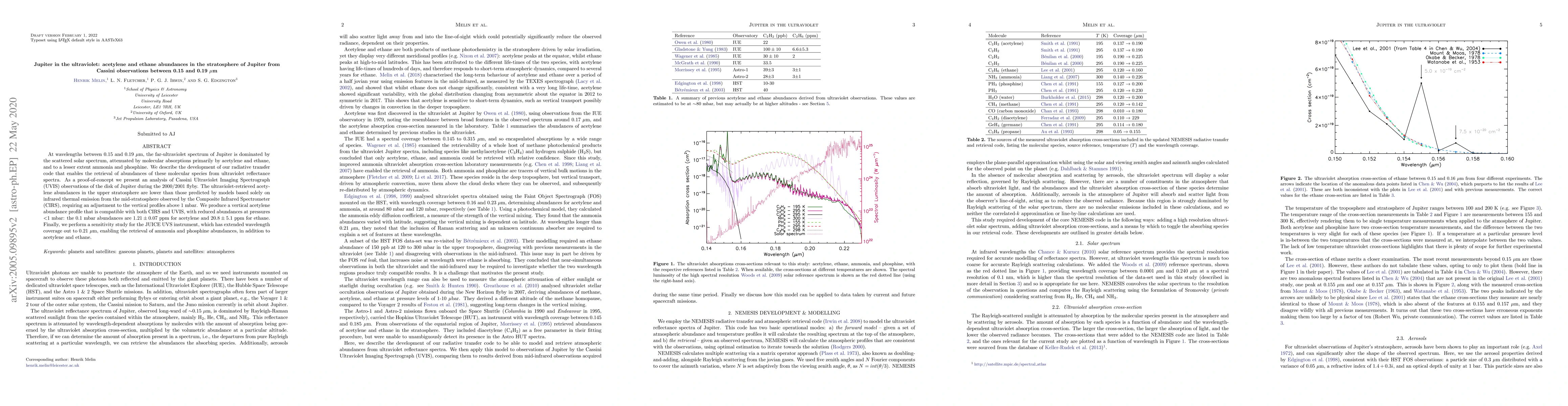 This paper develops a radiative transfer code to retrieve acetylene and ethane abundances in Jupiter's stratosphere from Cassini UVIS observations in the 0.15-0.19 µm range. The retrieved acetylene abundances are lower than infrared-based models, necessitating revised vertical profiles, and the study provides a consistent profile compatible with both infrared and ultraviolet data.