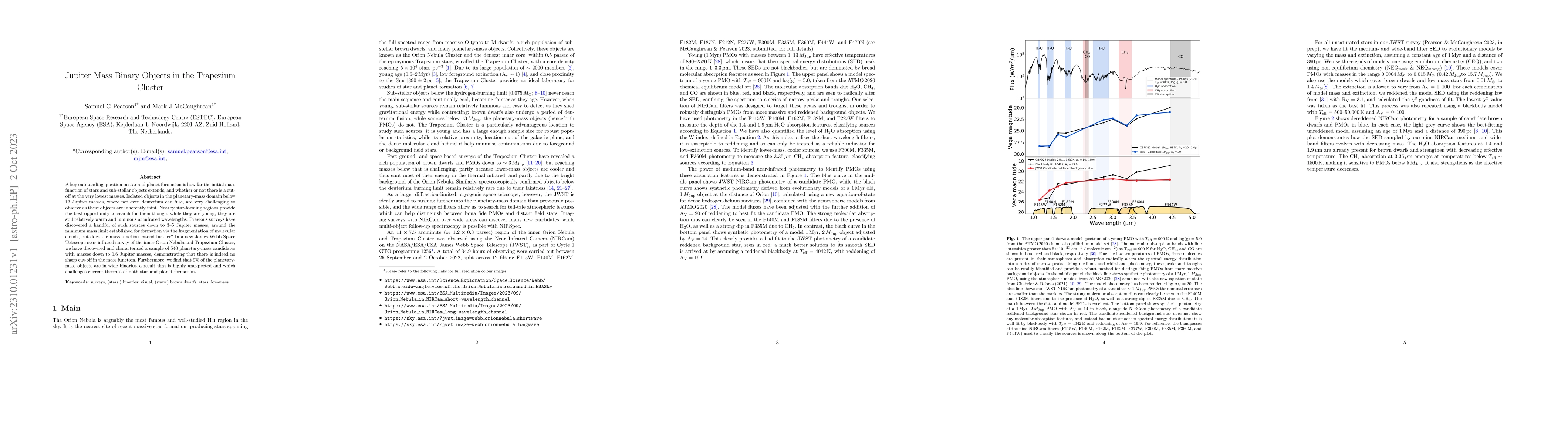 This study uses the James Webb Space Telescope to survey the Trapezium Cluster, discovering 540 planetary-mass objects down to 0.6 Jupiter masses, showing no sharp cut-off in the mass function. It also finds that 9% of these objects are in wide binaries, challenging current theories of star and planet formation.